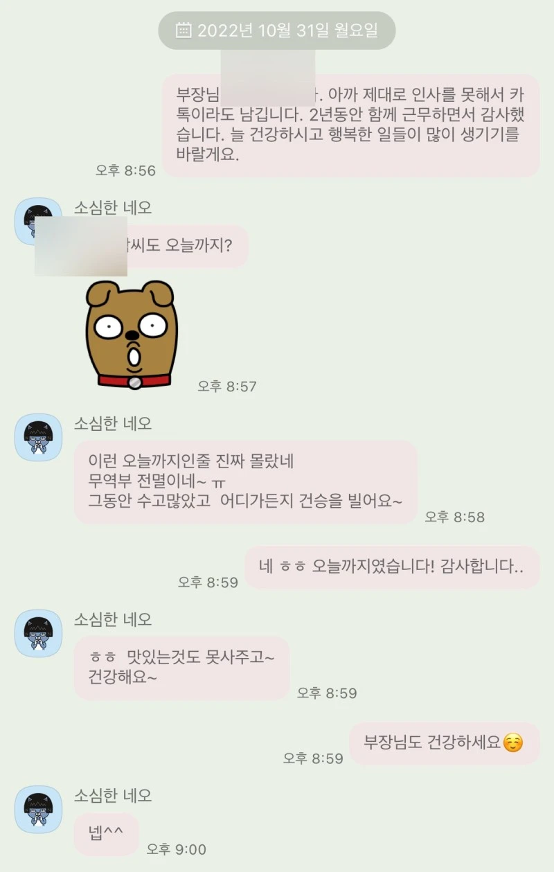 나는 해외영업 업무를 담당했다. 아이러니하게도 국내영업 일도 했기 때문에 국내영업 담당 부장님도 상사로 뒀었다. 나의 직속 상사는 아니었지만 함께 일을 했던 사람이라서 퇴근하면서 인사를 제대로 못해서 끝인사는 해야겠다 싶어서 카톡이라도 남겼는데