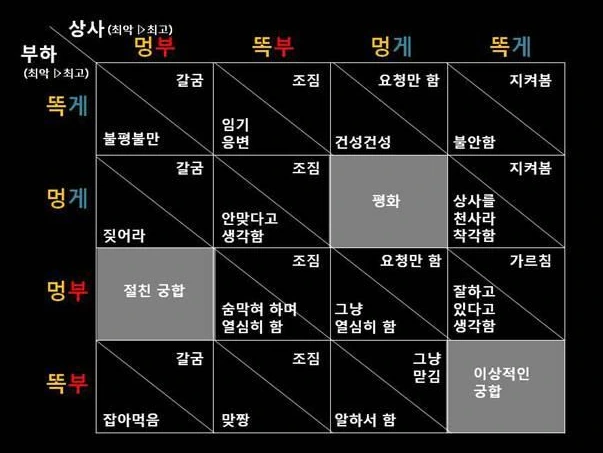 부장의 특징은 무능력함, 무책임함, 나 몰라라 전형적이 멍청이 부장이다. 일은 드 벌려놓고 나중에 하지 말라고 한다. 결국 실무 담당자인 내가 수습하고 해결한다.