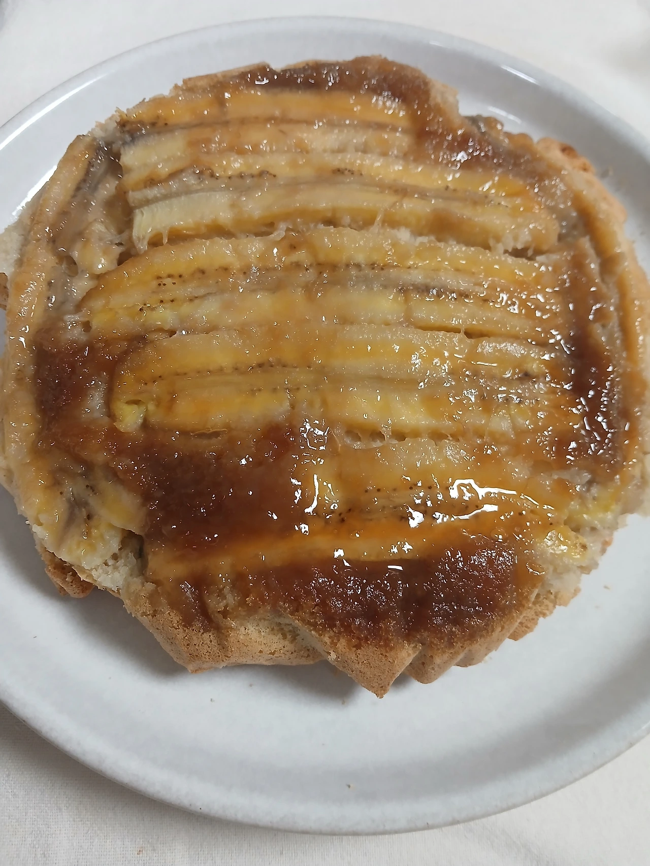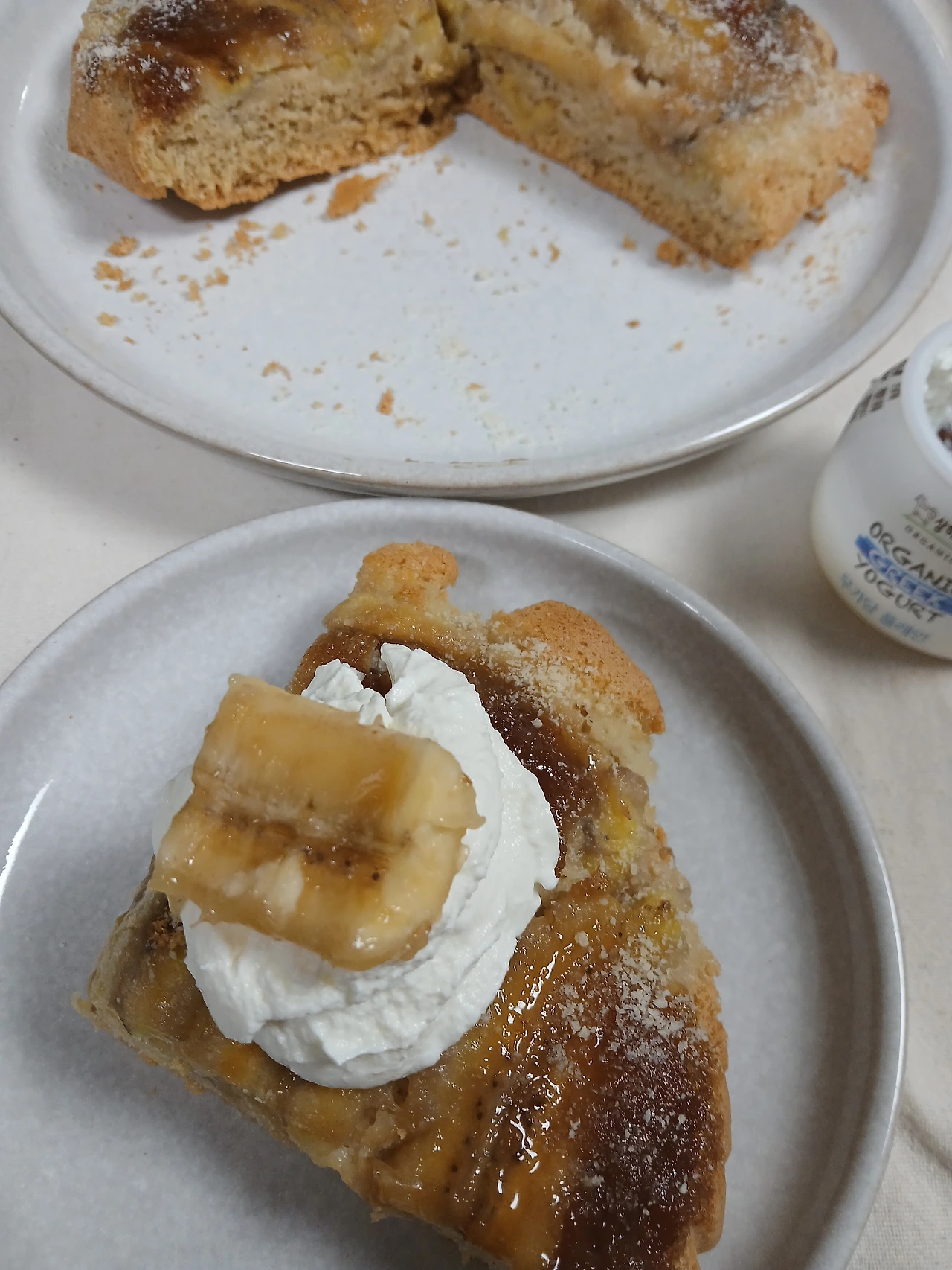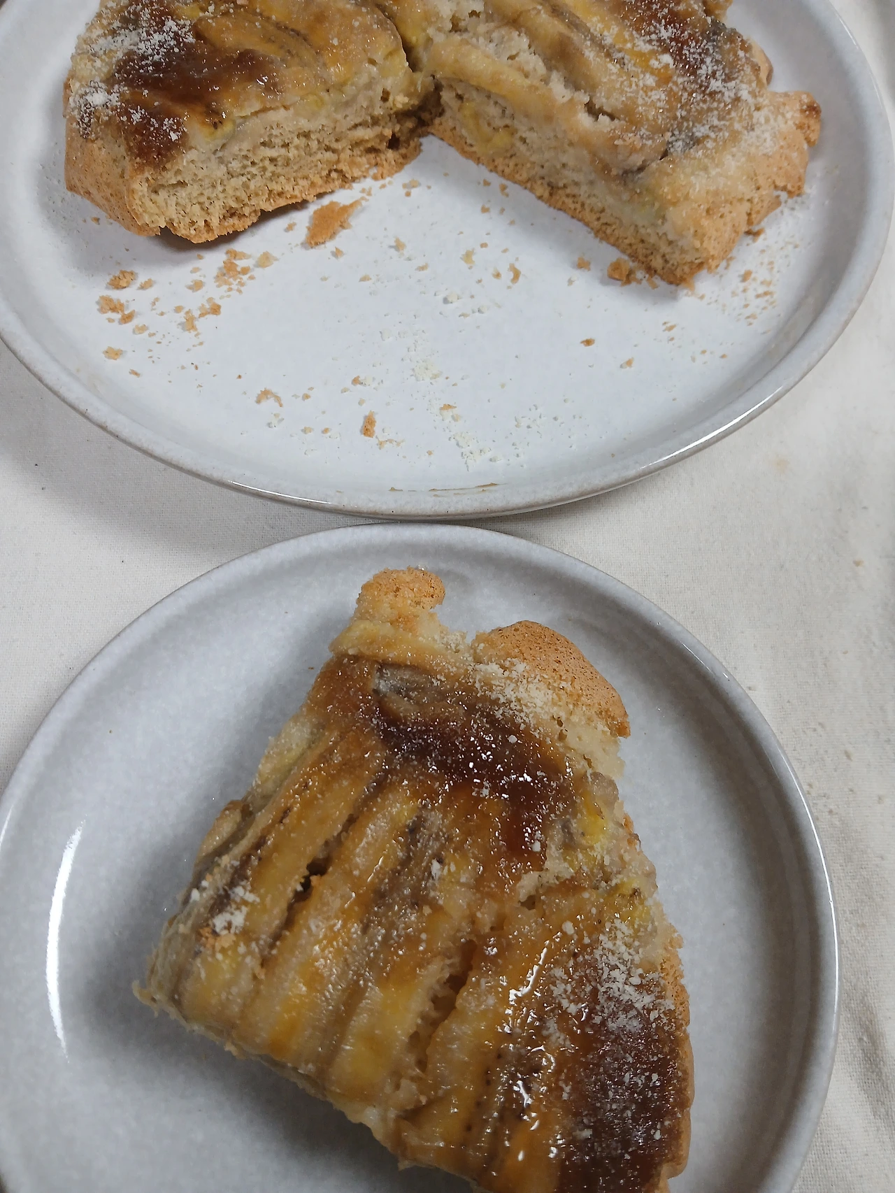 바나나 업사이드 다운 케이크, 파운드 케이크 반죽으로 해야 묵직한 감이 생기는데, 연구해본 결과 초저당 레시피엔 적합하지 않다. 내 방식대로 당도를 대폭 줄이면 버터의 크림화가 필요한 수준으로 올라오지 않아 분리된다. 마들렌 반죽도 괜찮으나 이 날은 버터를 안 먹을 생각이었기에, 동시에 당도를 최소화하기 위해 제누아즈 반죽으로, 그래도 맛있다.