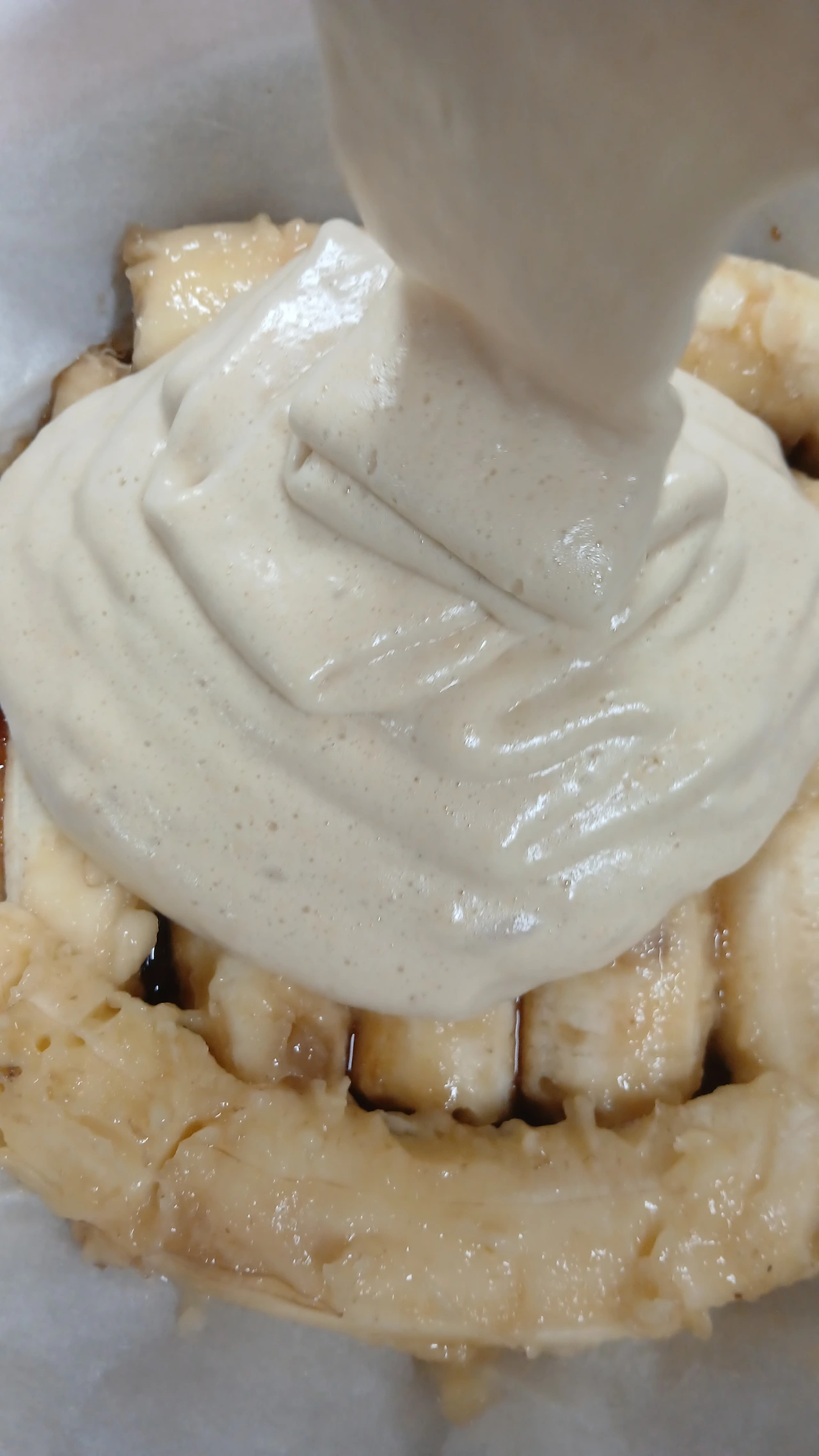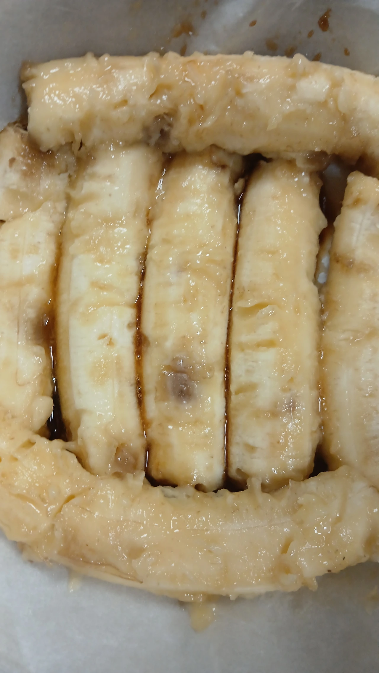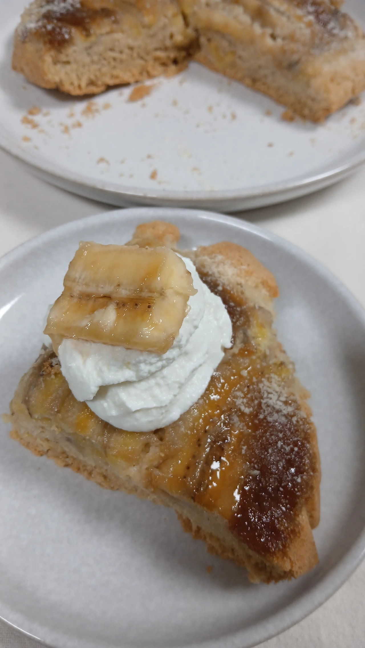 바나나 업사이드 다운 케이크, 파운드 케이크 반죽으로 해야 묵직한 감이 생기는데, 연구해본 결과 초저당 레시피엔 적합하지 않다. 내 방식대로 당도를 대폭 줄이면 버터의 크림화가 필요한 수준으로 올라오지 않아 분리된다. 마들렌 반죽도 괜찮으나 이 날은 버터를 안 먹을 생각이었기에, 동시에 당도를 최소화하기 위해 제누아즈 반죽으로, 그래도 맛있다.