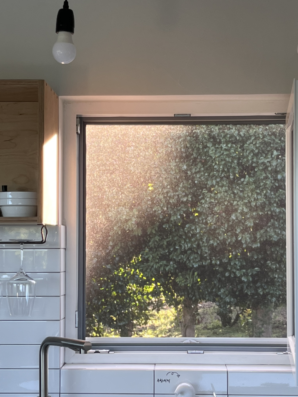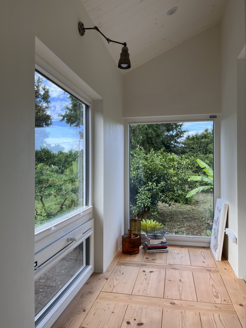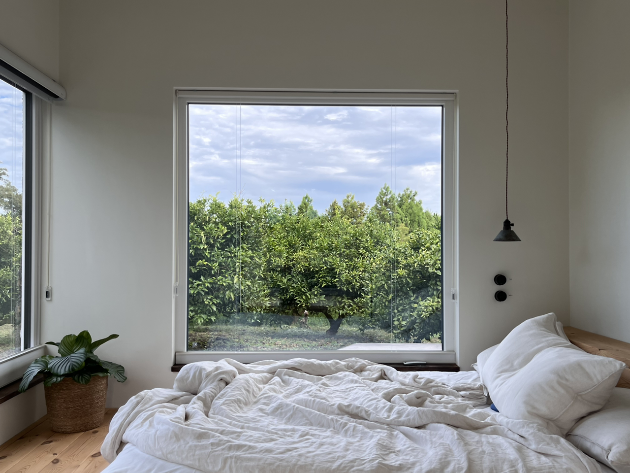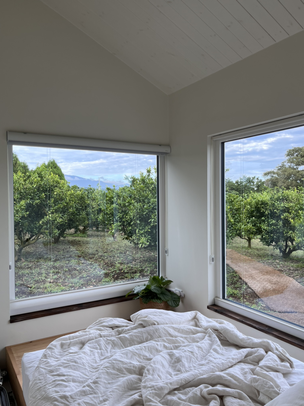 내가 꼽은 선흘별채의 메인 스폿은 바로 침실이다. 머리가 향하는 벽을 제외하고는 모두 큰 창문이 나 있다. 시선을 두는 곳마다 자연이 펼쳐져 있어서 마치 액자 속 그림을 보는 느낌.