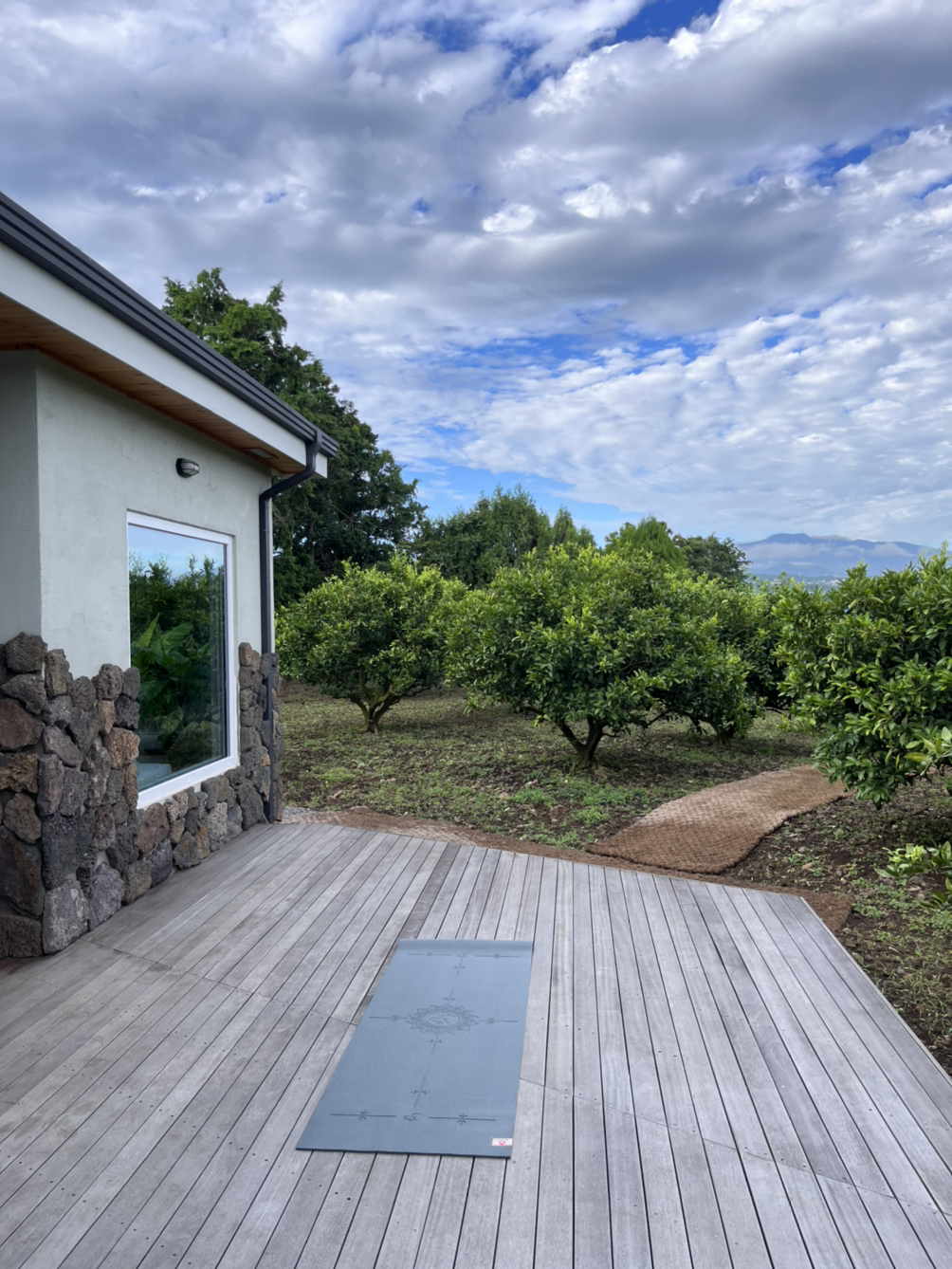 거실에는 밖으로 향하는 문이 3개 있다. 하나는 현관문, 나머지 2개는 야외 데크로 향한다. 데크에 서면 저 멀리 한라산이 보이고, 코앞에는 초록빛 청귤이 주렁주렁 열린 귤나무가 가득하다. 마침 숙소에 요가 매트가 있어서 나는 아침에는 스트레칭을 하고 밤에는 별로 가득 찬 하늘을 감상했다. 서울과 비교할 수도 없이 많은 별들을 보고 있자면 행복이 차올랐다.
