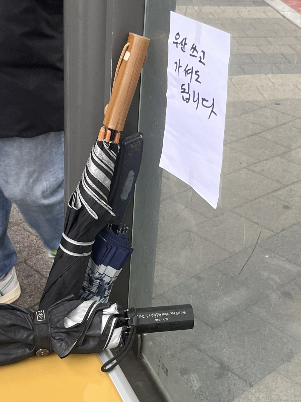 비는 오는데 우산이 없어 울상이 될 뻔한 이들을 위한 배려였다. 누가 두었는지는 모르겠지만 한남동 버스정류장에 설치된 온열의자만큼이나 마음이 따뜻해졌다. 이날 툭 세워진 우산에 잠시동안 시선이 머문 이는 나뿐만은 아닐 테지.