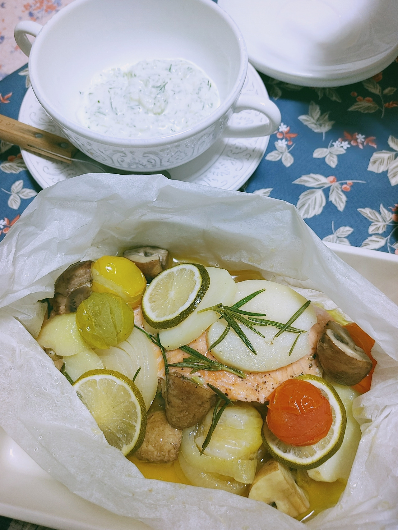 나는 매일바이오 그릭요거트를 써봤는데 이 제품은 그릭요거트 치고 수분이 많아서 원래의 차지키소스 농도가 아니었을 것 같지만 어쨌든 재료들의 조합만으로도 연어 빠삐요뜨와 잘 어울렸다.