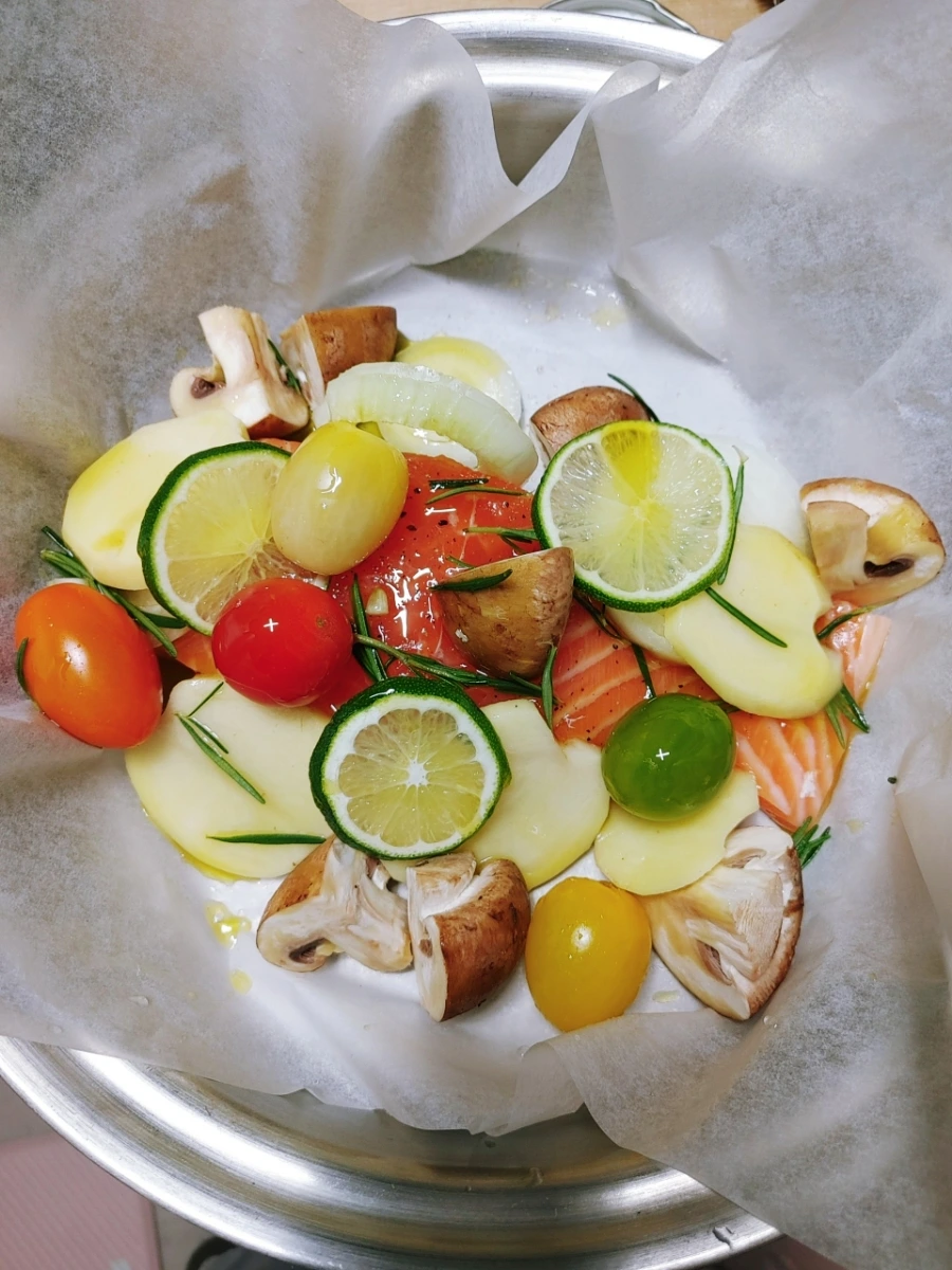 암웨이퀸 대형프라이팬(없으면 7중 스테인리스 팬이나 무쇠팬)에 유산지를 넉넉히 깔고 연어를 가운데에 두고 둘레에 야채를 넣는다