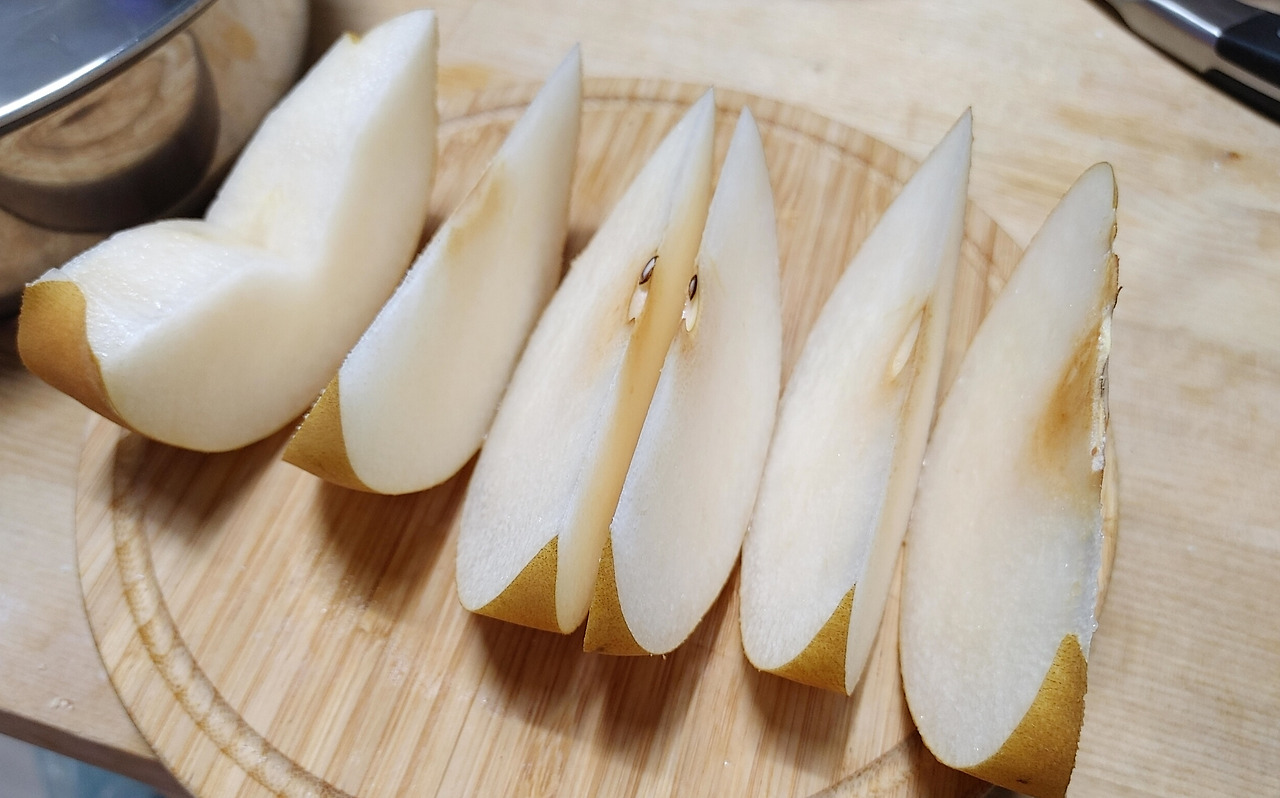 성인 여성 주먹 두 개짜리 크기의 배 반 개를 8조각 내었다.