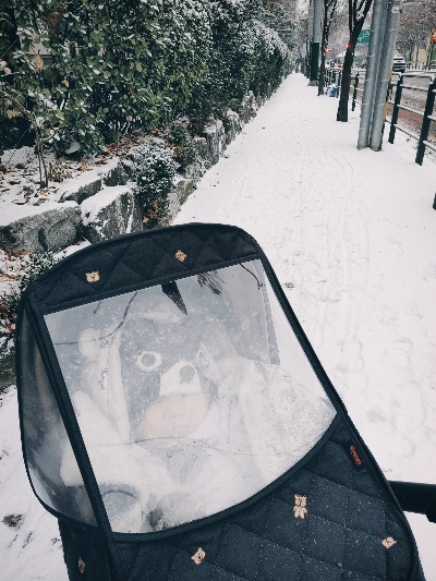 아파트 1층에서 거리로 나오니까 하얀 눈으로 덮여 밝아진 세상이 예쁘긴 하다. 그 예쁜 주변을 찬찬히 미소 지으며 셀카라도 남기면 좋으련만 셀카 아닌 애기 유아차 사진이나 찍는 엄마. 눈으로 하얘진 주변을 감상한다기보단 눈 배경의 애기가 더 이쁘고 좋은 고슴도치 엄마이다.