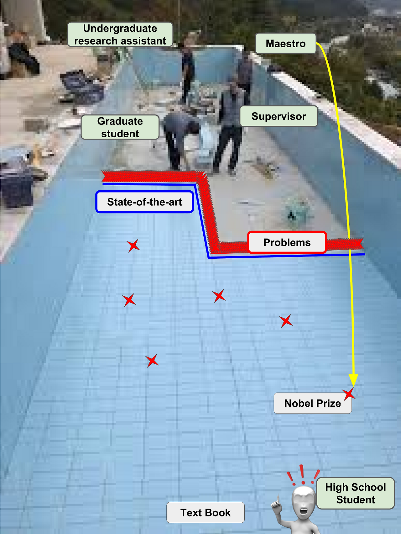대학원생 (graduate student)은 지도교수 (supervisor)의 지도에 따라 타일을 덮는 연습을 한다. 파란 선분으로 표현된 부분은 state-of-the-art라 불리는, 어떤 문제의 가장 최신 해결책을 담은 논문이 발행되는 지점이다. 이 영역에 연구자 (researcher)가 풂직한 문제가 있다. 학부연구생 (undergraduate research assistant)은 문제에 가까이 가지 못하고 공중에 뜬소리를 하는 경우가 종종 있다. 대가의 시선으로 모든 문제를 해결할 것처럼 크게 말하지만, 사실은 단 하나도 제대로 이해하지 못하고 하는 말인 경우가 많다.