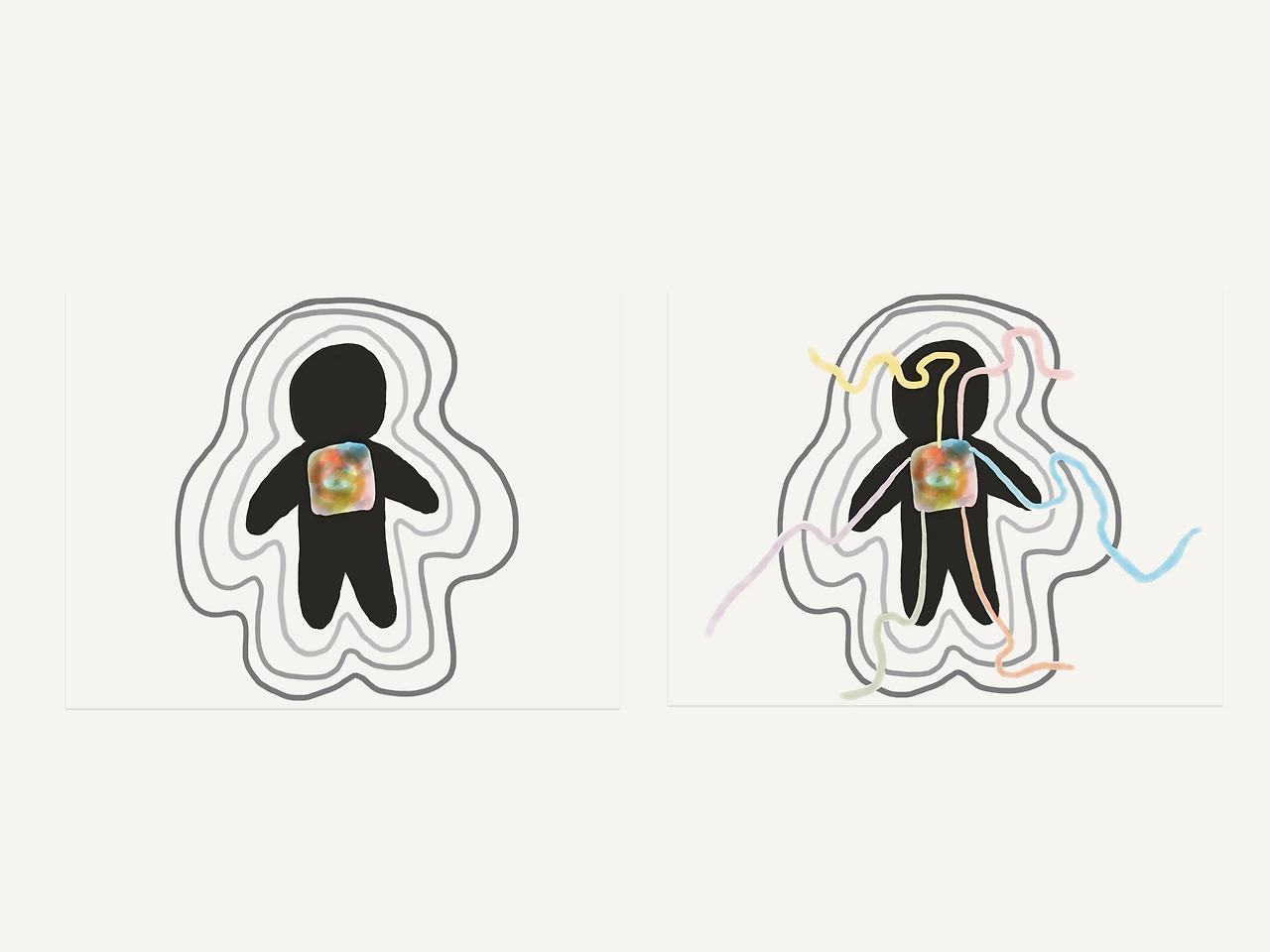 아래 그림에는 두 가지 사람이 그려져 있다. 어떤 사람이든 그 어린 시절이 있고, 자기 마음이 있고, 감정이 있고, 생각이 있고, 성격이 있고, 기질이 있고, 특징이 있고, 경험이 있고, 추억이 있고, 그 모든 것들을 한 사람의 마음속에 고유하게 품고 살아간다. 누구나 마음속에 모든 종류의 가능성을 품고 있다. 성인이 되어 우울한 사람도 아기때는 세상 행복하게 웃어본 적이 있을 것이다. 자라면서 그 씨앗을 발현하는데, 어떤 색의 씨앗을 꺼내었는지, 또 어떤 색의 씨앗을 아직 꺼내지 않았는지가 사람마다 모두 다를 뿐이다. 뭔가를 잘 하지 못하겠다면, 그것을 배우지 않아서가 아니라 아직 발현하지 않아서 그런 것이다. 아직 씨앗인 채로 품고 있는 것 뿐이다.