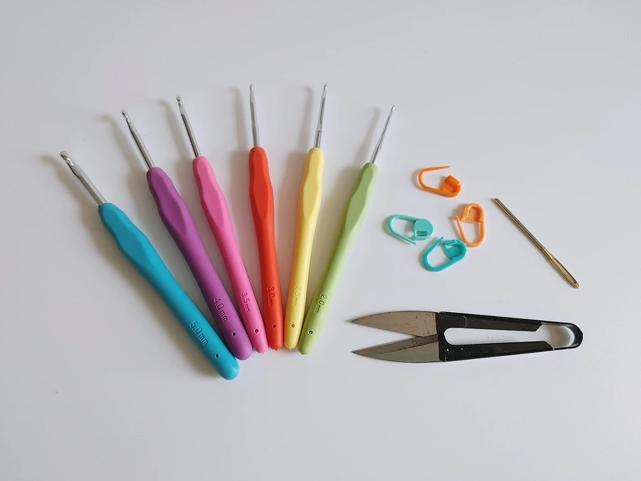 뜨개질용 바구니에 상시 구비하는 준비물 - 코바늘, 표시용 고리, 돗바늘, 쪽가위