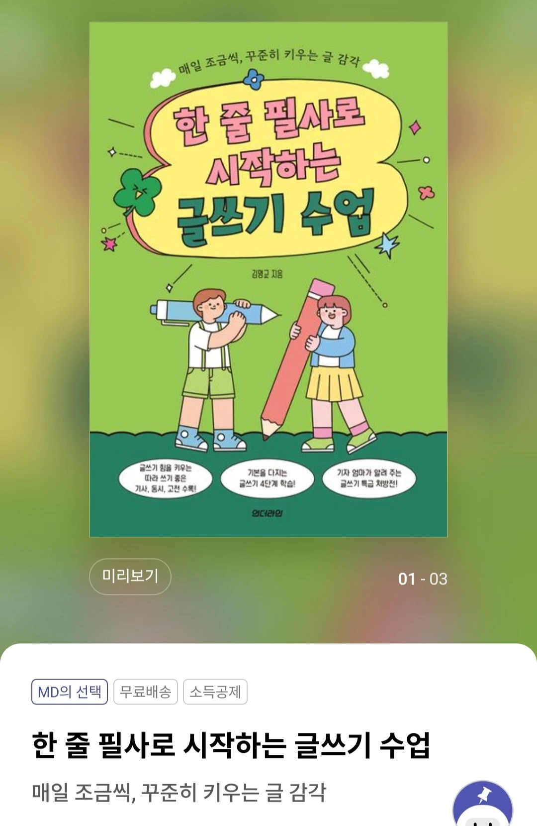 방학이니까 학교에서 했던 글쓰기를 이어가려고 한다. 학교에서는 주 1회 주제 글쓰기, 한 줄 독서록, 자유 글쓰기를 하고 있었다. 이번 겨울방학에는 필사 글쓰기와 다섯 줄 글쓰기를 하려고 한다. 가볍게 할 수 있는 것들이어서 주 2회 정도면 적당하지 않을까. 학원 숙제도 있어서 글쓰기만 매일 할 수는 없어서 가벼운 걸로 골라봤다. 우선 한 줄 필사로 시작하는 글쓰기부터!