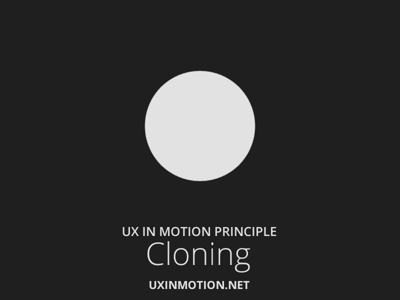 위의 세 가지 예시는 사용자의 관심이 해당 오브젝트에 집중되는 동안 메인이 되는 오브젝트에서 새로운 객체가 생성됩니다. 크게 2뎁스로 구성된 이 방식은 먼저 관심을 끌게 하고 복제된 새로운 오브젝트를 생성해 시선을 유도하게 됩니다. 명확하게 연결되는 이벤트로 인해 효과적인 커뮤니케이션을 할 수 있습니다. 즉, 'A'는 새로운 자식 오브젝트를 생성하면서 'B'가 됩니다.