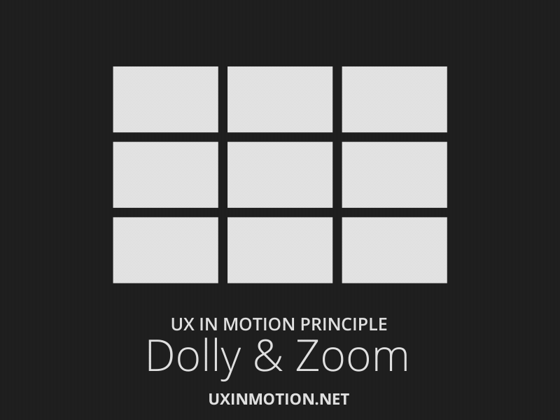 UX에서 공간적으로 보면, 이 움직임은 사용자의 시점(Perspective)의 변화와 오브젝트가 위치를 변경하면서 남아있는 정적인 시점을 나타냅니다. 'Dolly' 원칙은 매끄러운 맥락의 흐름을 통해 사용성을 개선하고, 인터페이스 오브젝트와 대상을 자연스럽게 전환시킵니다. 또한, 'Dolly'는 'Dimensionality(11번째 원칙)'원칙을 통합하여 보다 넓은 공간적인 경험과 깊이를 제공하고, '앞' 또는 '뒤'에 있는 추가 영역이나 내용을 사용자에게 전달할 수 있습니다.