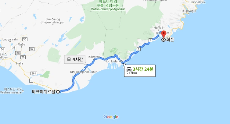 전 날 머물렀던 비크이뮈르달 마을에서 오늘 머물 숙소가 있는 회픈(HOFN)까지는 차로 대략 3시간 12분 걸린다. 꽤나 먼거린데 중간중간 아이슬란드 대자연을 구경하며 오다 보니 3시간이라는 생각이 들지 않는다.