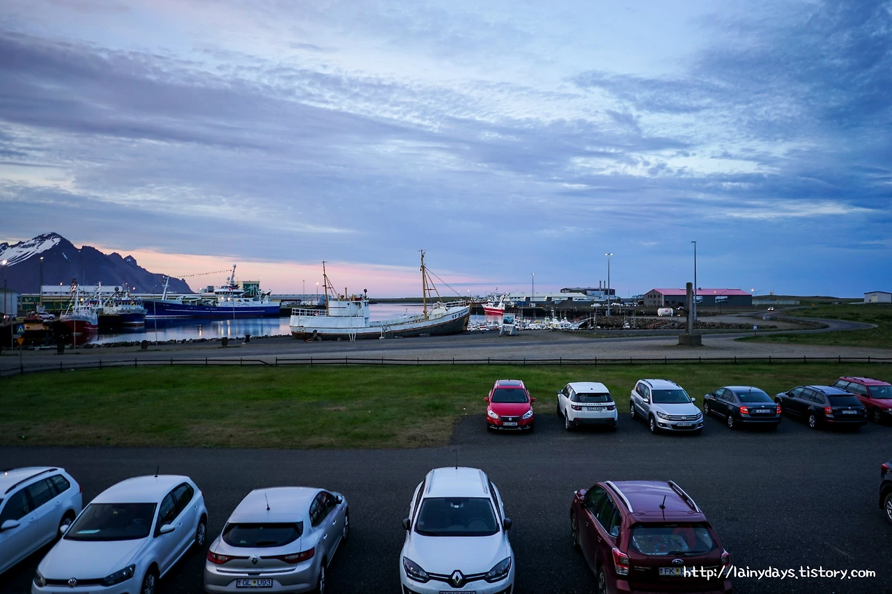 아이슬란드의 살인적인 물가를 다시 한번 체험한 날이었다. 호텔비도 식당도. 식과 주에 눈퉁이를 맞고 눈물 또르르 흐르려다.. 이 풍경을 보고 멎었다(우). 아마 22시 즈음... 된 항구 풍경으로 기억한다. 해가 질듯 말 듯 밀당할 때의 하늘이 보랏빛으로 물든다.