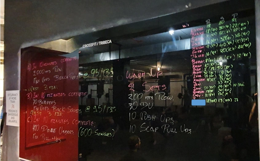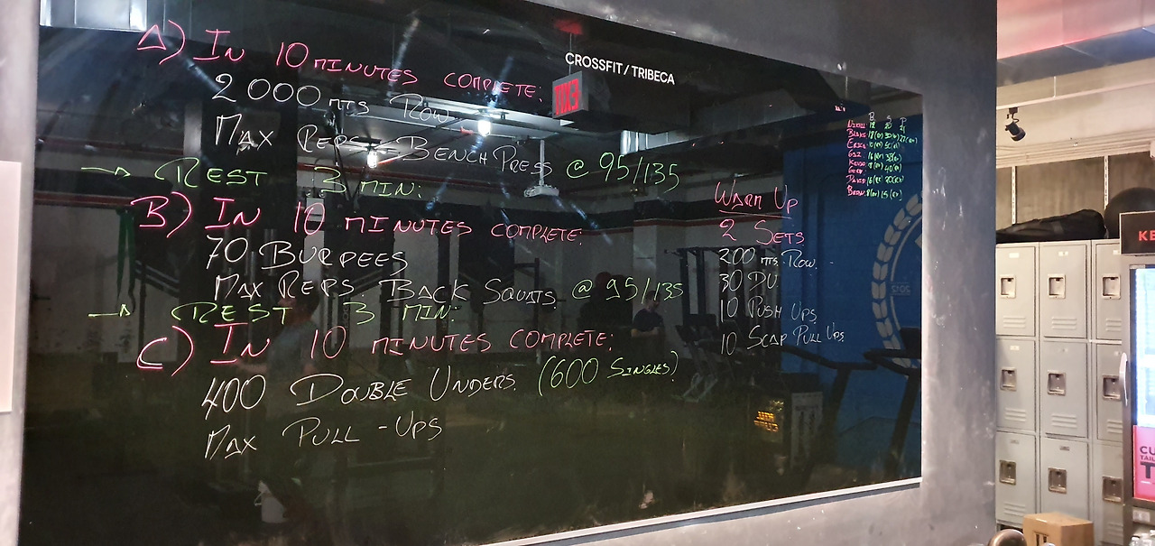 마지막 한마디와 함께 직원은 나를 끌어안고 하이파이브를 하는 등 스웩 넘치는 행동을 취했다. 그와 잠시 헤어지면서 칠판을 슬쩍 쳐다봤다. 오늘 마지막 타임 와드로 추정된다. 미국 크로스핏에서는 특별한 와드를 하려나? 궁금해서 운동 내용을 훑어본다.