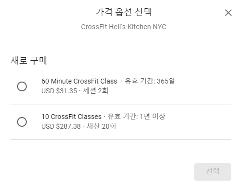 이를 누르면 요일 별 예약 가능한 시간대가 뜨고, 예약 버튼을 누르면 지불방법과 가격대 선택 화면이 뜬다. (이는 크로스핏 박스마다 조금씩 다르다) Hell's Kitchen의 경우 1시간 클래스 두 번 하는데 약 31달러가 필요하다. 원화로 환산하면 대략 3.6만 원 수준. 1회에 대략 1.8만 원 수준이며 한국보다 약간 비싸다.
