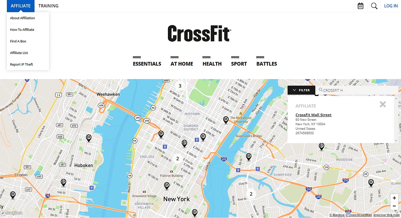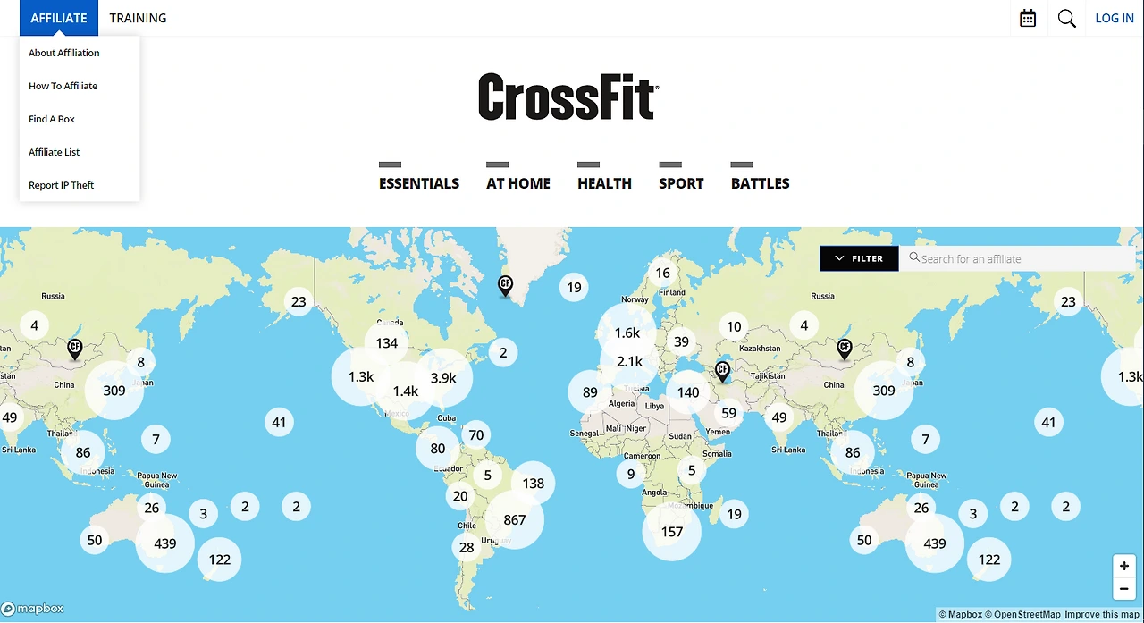 위 주소로 접속하면 전 세계 국가 별 크로스핏 개수나 위치를 쉽게 파악할 수 있다. 또한 검색을 통해 특정 크로스핏 박스가 등록이 되어 있는지 여부도 확인 가능하다. 만약 크로스핏 박스 이름을 모르고 해당 지역을 방문할 예정이라면 그 지역의 크로스핏 박스의 등록 여부도 확인 가능하다.