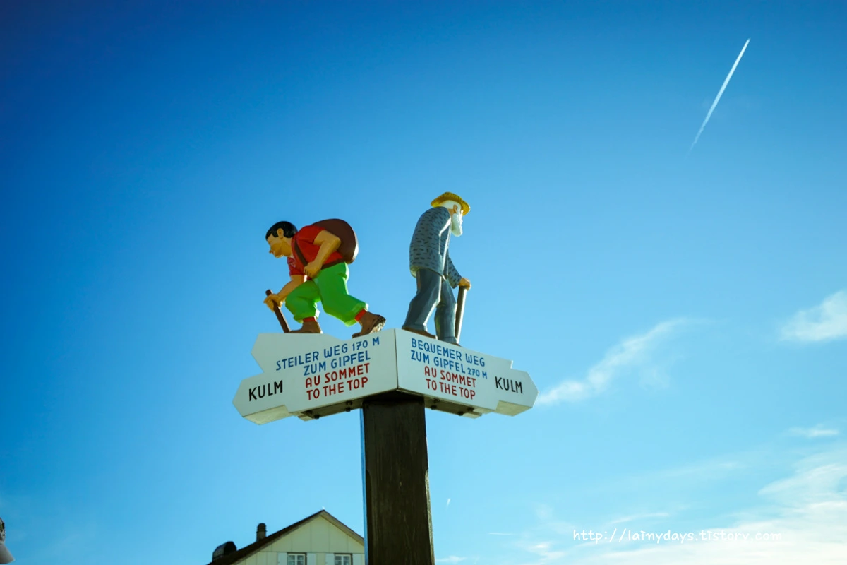왼쪽 사진에 보이는 것은 정상 전망대로 가는 길을 가리키는 이정표인데, 젋은이가 가리키는 길은 170m에 불과하지만 가파르고 미끄러운 길이고, 노인이 가리키는 길은 270m 정도 되지만 상대적으로 완만하여 오르기 쉬운 길을 의미한다. 재미있는 센스. 나는 할아버지가 가리키는 길로 올라갔다. 조금 돌아가기는 해도 리기산의 풍경을 즐기기에 안성맞춤이기 때문이다.