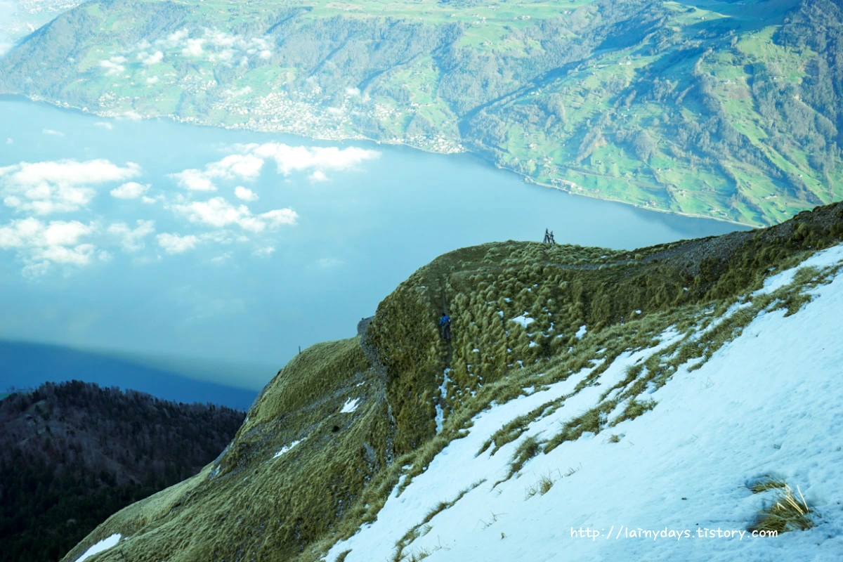 내가 리기산 정상이 보여주는 풍경에 넋을 잃고 있을 즘 누군가가 가파른 산길을 타고 올라오고 있었다. 시간과 체력만 여유있으면 산악열차보다는 저렇게 걸어서 오르고 내리는 것이 여왕의 품을 온전히 느끼는 방법 이리라..