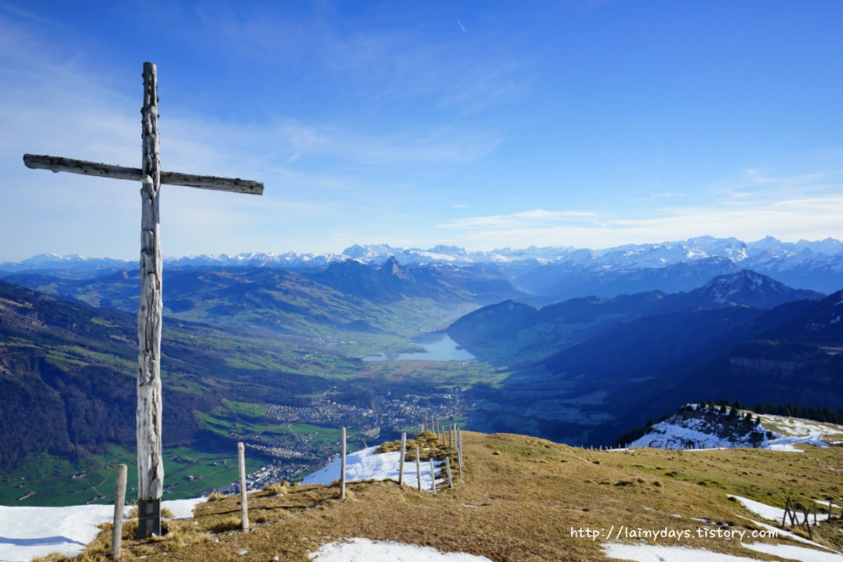 산 정상에는 전망대 외에도 송신탑이 있다. 멀리서 볼 땐 그리 커 보이지 않았으나 가까이 다가가니 굉장히 거대한 모습을 드러낸다. 그리고 송신탑 뒤로는 리기산의 반대편 풍경이 펼쳐지는데 그야말로 입이 다물어지지 않는 풍경이다. 사진은, 실제 풍경의 1/100도 담아내질 못했다.
