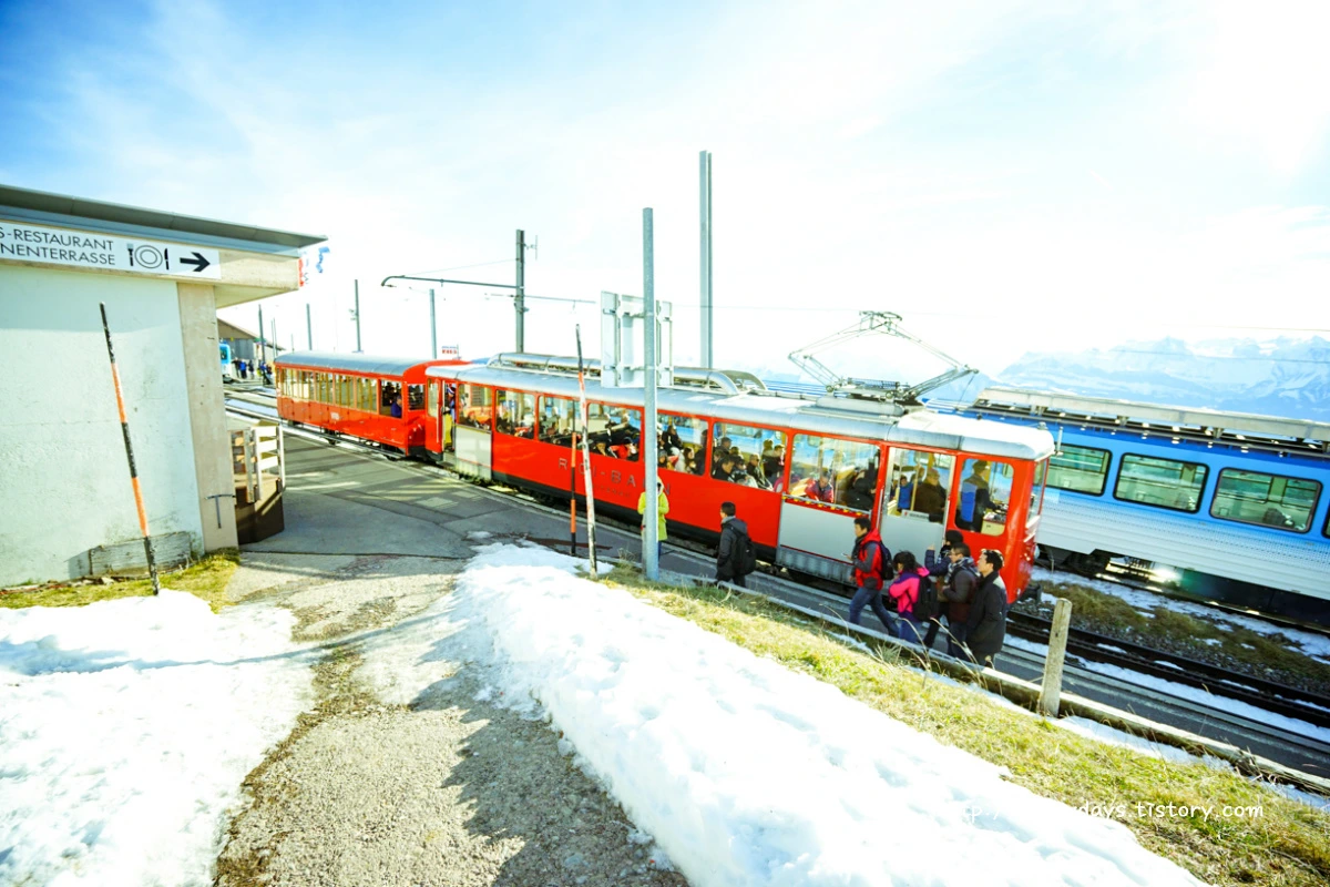 나 역시 유람선을 타고 피츠나우에서 내려 산악열차를 타고 리기산에 올라갔다. 위 사진에서 오른쪽에 보이는 빨갛고 예쁜 열차가 바로 리기산까지 오르는 산악열차다. 열차 뒤편으로는 거대한 높이의 리기산이 단단하게 버티고 서있다.