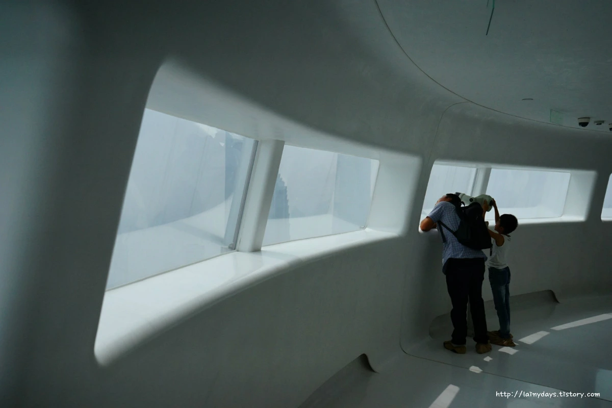 계단이 보인다. 위로 한 층 더 올라갈 수 있다는 얘기다. 위로 올라가면 뭔가 달라질까? 달라진다. 바로 아래층보다 훨씬 더 넓고 선명한 창이 있다. 유리창을 통해 상하이 풍경을 내려다본다. 360도 전 방향에 유리창이 있기 때문에 보고 싶은 곳을 다 볼 수 있다. 하지만 이 날따라 날씨가 무척 흐려서 멀리까지 맑게 보이지는 않은 것이 아쉽다.