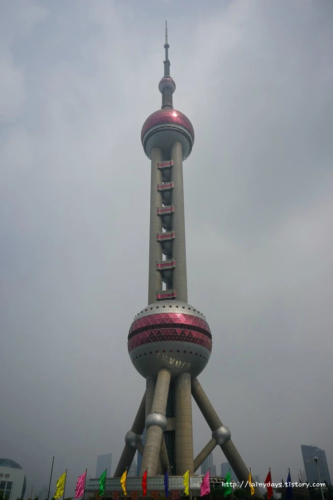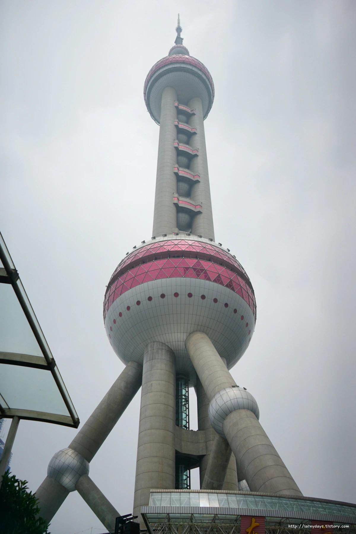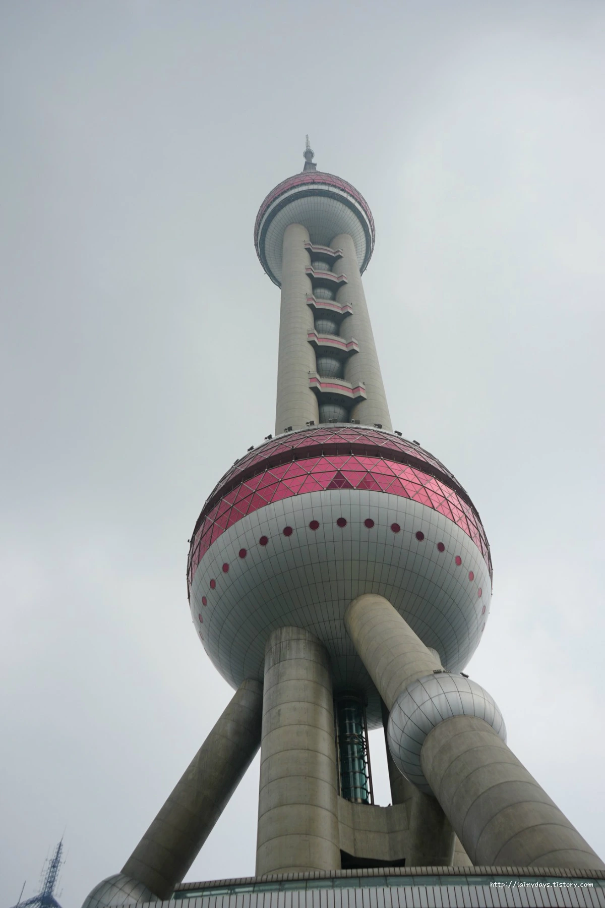 커다란 구슬 3개가 크기 역순으로 위에서부터 기다란 막대기에 꽂힌 모양이다. 각각의 구슬은 전망대 역할을 하는데 위로 올라갈수록 입장료가 비싸다. 참고로 중간 정도가 상하이를 즐기기 가장 좋은 높이고 제일 높은 곳에 있는 구슬에서는 밖을 제대로 보기가 어렵다. (아래 글 참고)