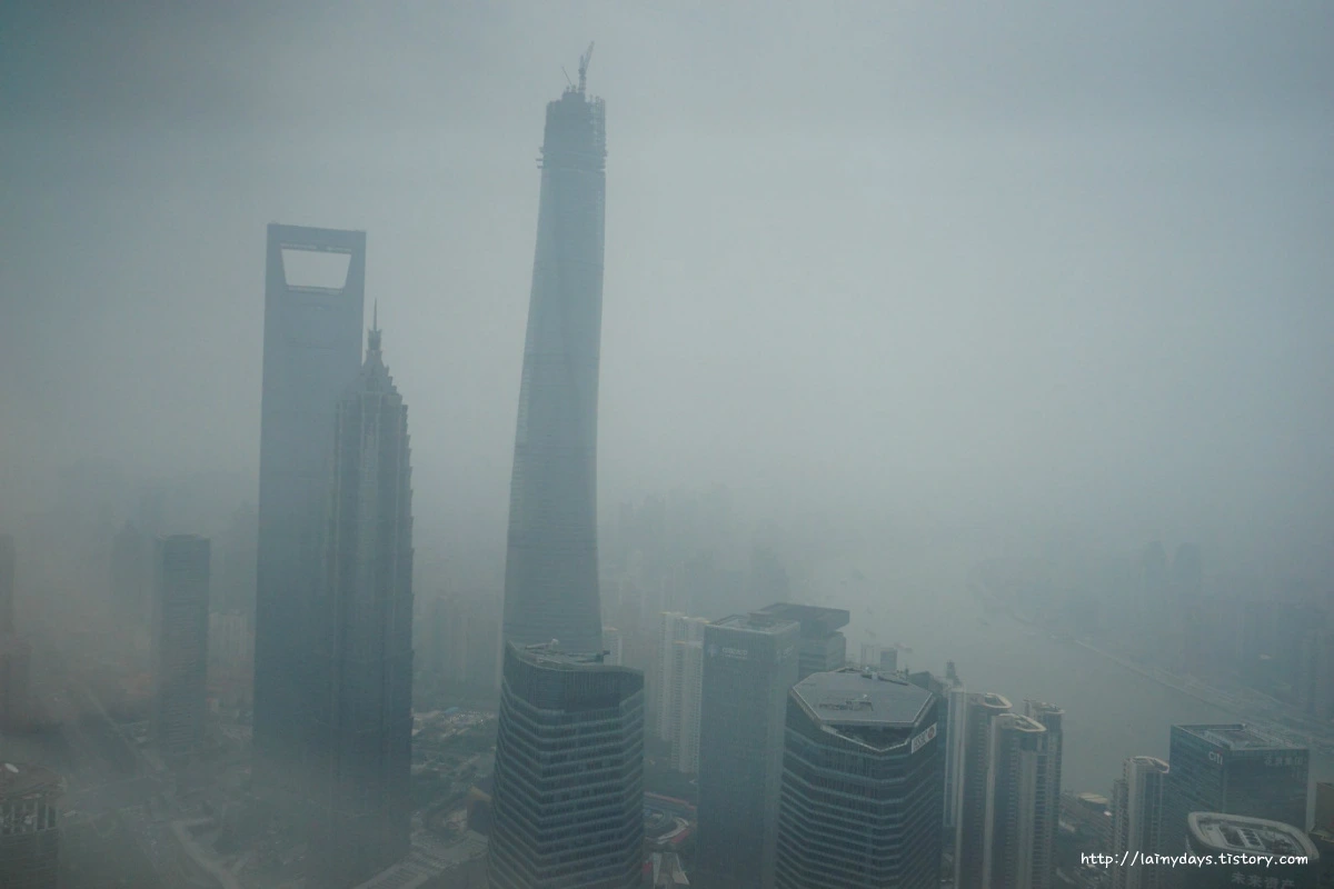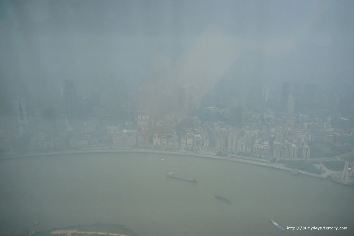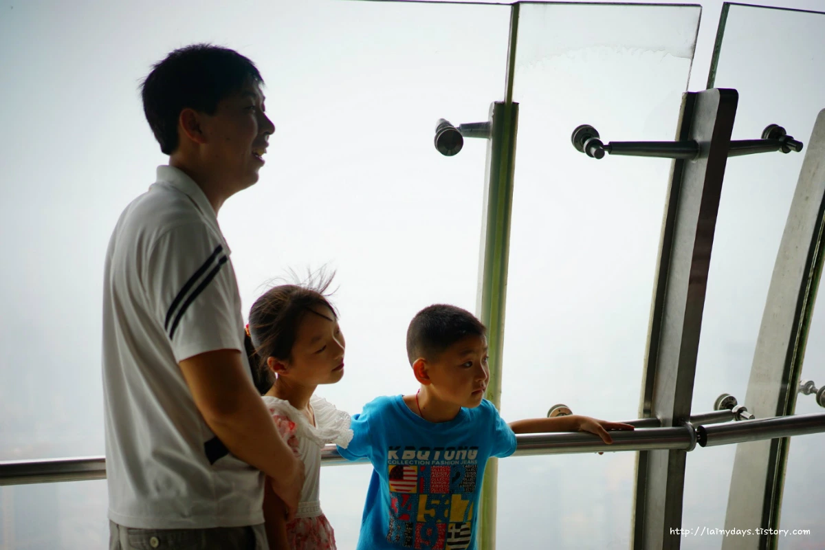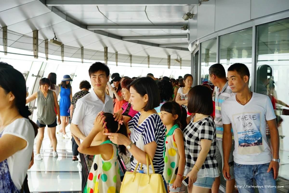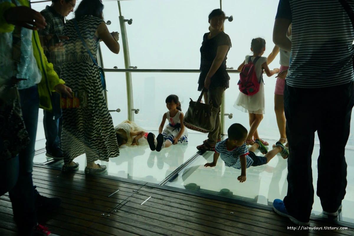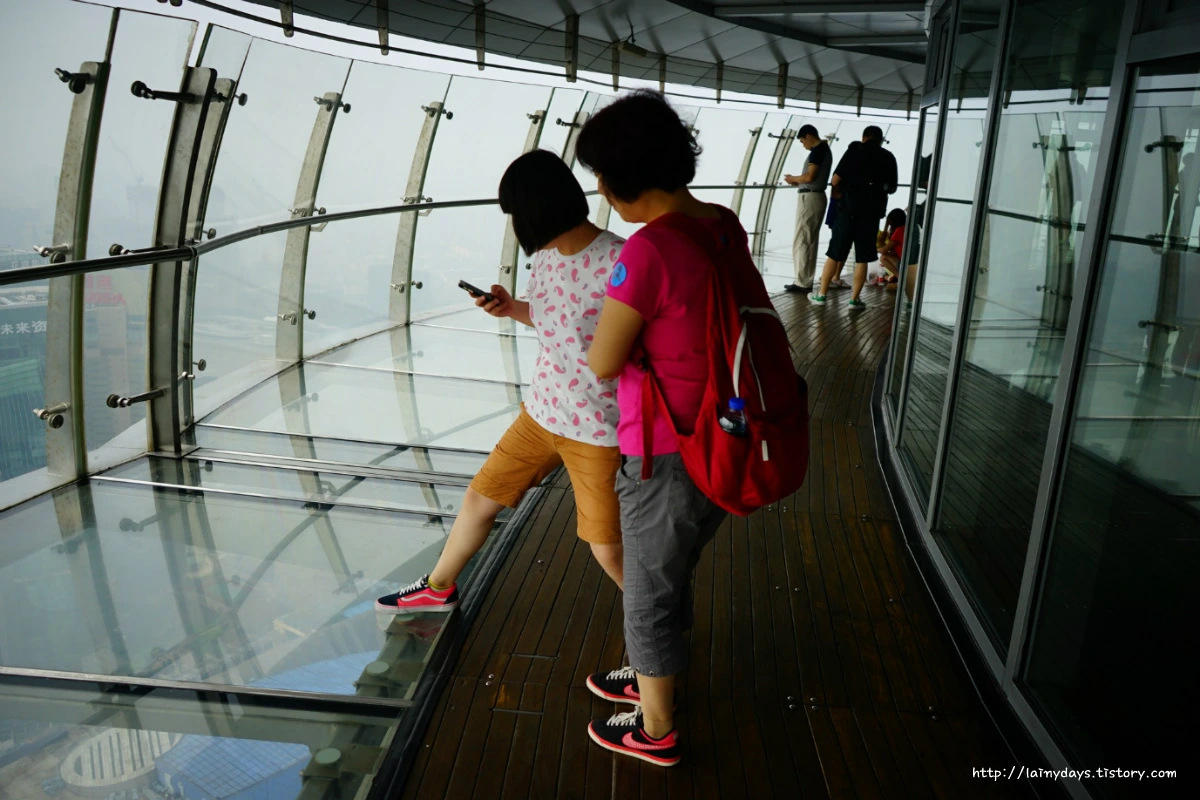 90m 전망대는 상당히 인도적이다. 바닥이 유리로 되어 있어서 심장을 혹사시킬 이유도 없고 유리창이 없어서 시원한 시야를 보여준다. 높이와 재미, 짜릿함과 공포감은 없지만 3개의 전망대 중 가장 편안하게 상하이 풍경을 감상할 수 있다. 이 날 따라 날씨가 흐렸을 뿐 맑았다면 더욱 예쁜 풍경을 보여주었을 것. 사람에 따라서는 사실 이 정도 높이만으로도 충분할 수도 있겠다.