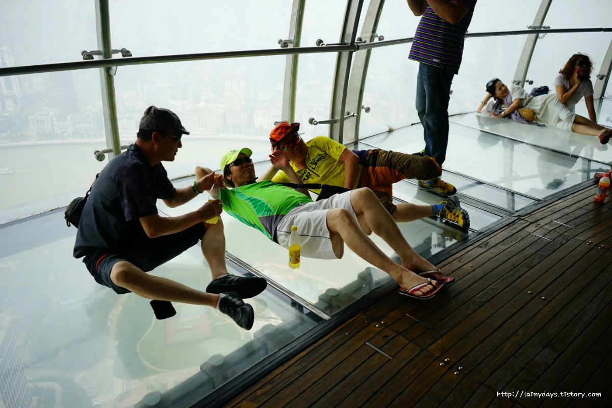 위 사진은 상하이 동방명주 탑 투명 전망대를 즐기고 있는 여러 어른들의 모습이다. 모두들 한결같이 얼굴에 미소와 웃음을 띠고 있다. (애초에 겁이 많아 웃음을 띠지 못하는 사람들은 저기 올라가지도 않는다)