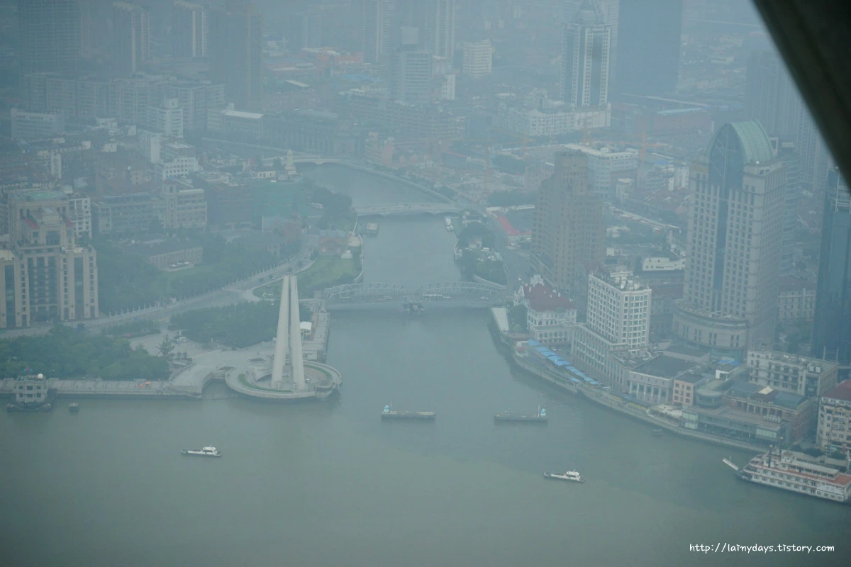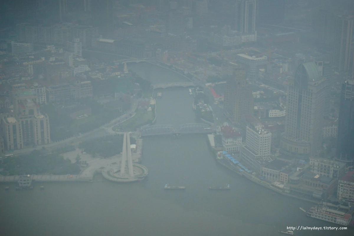 엘리베이터는 꽤나 순식간에 사람들을 실어나른다. 첫 번째 덱에 도착하여 황푸강을 바라본다. 저 멀리 외백 대교가 보인다. 꽤나 높았던 건물들이 순식간에 낮아진 걸 보니 첫 번째 덱의 높이를 실감하게 된다.
