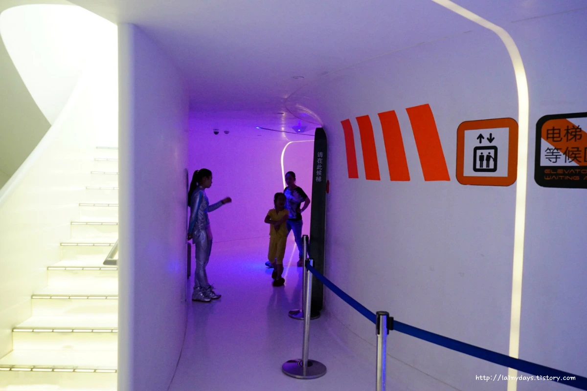 벽에 설치된 통?으로 들어가면 동그란 구멍을 통해 상하이 풍경을 볼 수 있는데 구멍이 작기도 하고 제대로 보이진 않는다. 여기저기 교육용 자료를 보여주고 있고 작동하지 않는 우주선 문을 닮은 장식도 있다. 이쯤 되면 뭔가 실망할 법도 하지만..