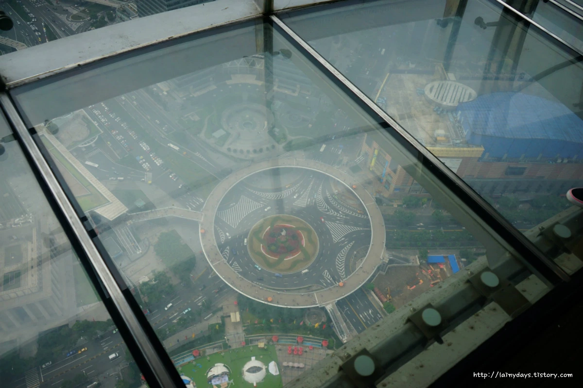가장 꼭대기 전망대를 다 즐기고 다시 263m 전망대로 돌아왔다. 여기서도 또 한 가지 놓치기 쉬운 동방명주의 명물이 하나 보이는데 그것은 바로 바닥이 유리로 된 전망대. 263m 전망대에서 계단을 통해 한 층 내려가면 볼 수 있다.