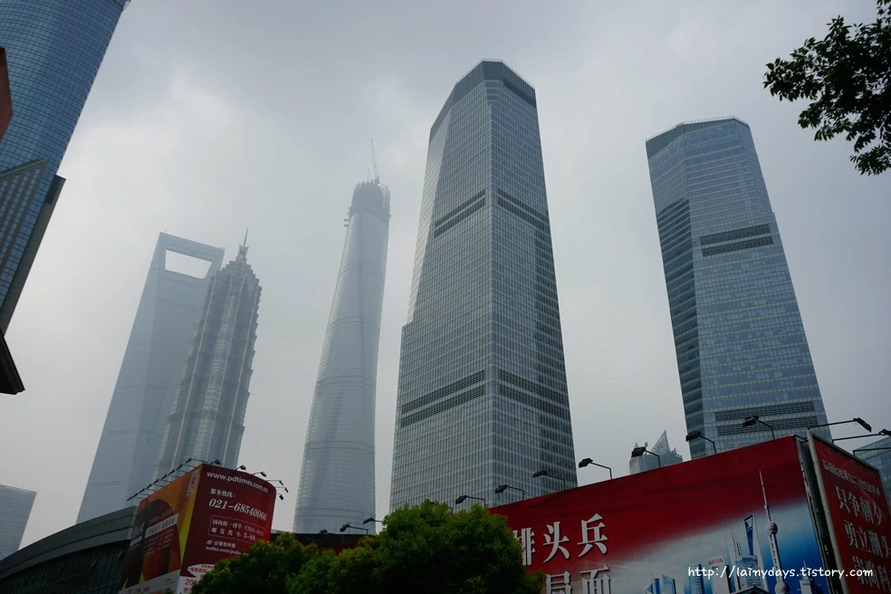 동방명주를 보기 위해 푸동지구로 넘어가 본다. 맑지 않은 회색빛 하늘이 상하이와 잘 어울린다는 생각을 잠시 해본다. 푸동지구는 바로 건너편에 있는 와이판과는 전혀 다른 매력을 보여주는 곳이다. 와이탄이 1900년대에 그대로 머물러 있다면 푸동지구는 2100년을 향해 앞으로 나아가는 곳이라고 해야 할까. 푸동지구에 도착하자마자 고층 건물들이 여행자를 반긴다. (상하이 국제 금융센터, 진마오타워, 완공 괴기 전 상하이 타워 등이 보인다)