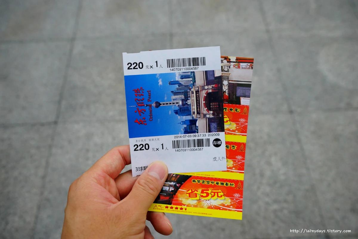 동방명주는 높이에 따라 전망대가 총 3개(90m/263m/350m)로 구분이 되고 그에 따라 입장권 가격도 달라진다. 제일 꼭대기층까지 갈 수 있는 입장권은 220위안으로 한화로 약 3.9만 원이다. 참고로 여기엔 동방명주 탑 1층에 있는 상하이 역사박물관 입장료도 포함되어 있다.