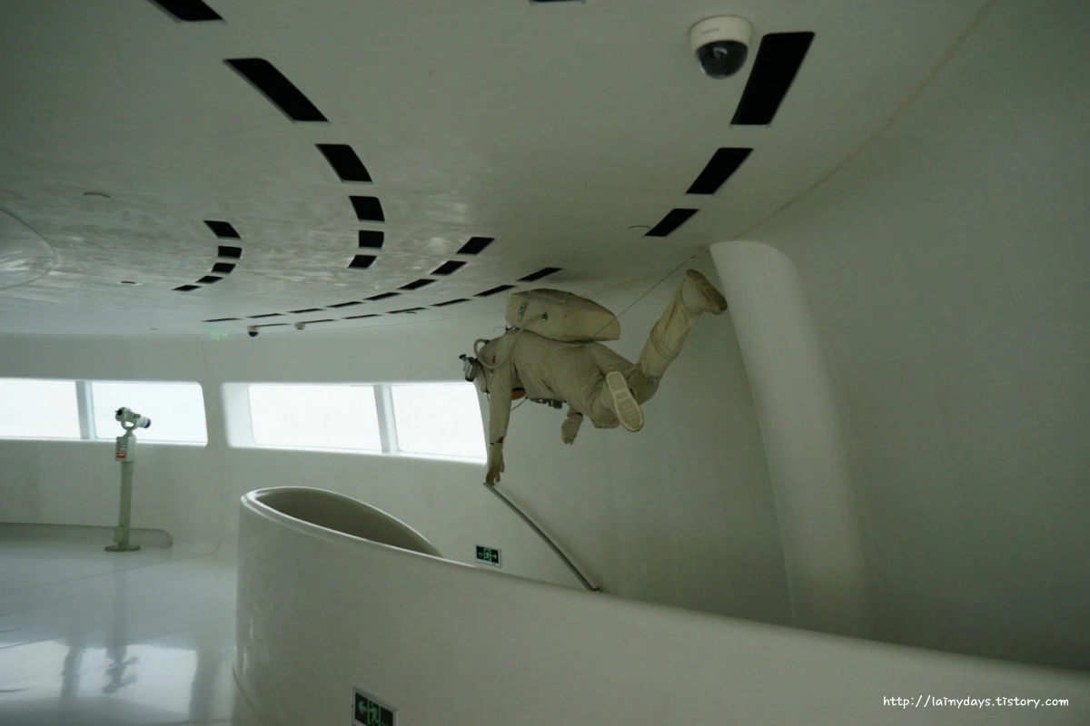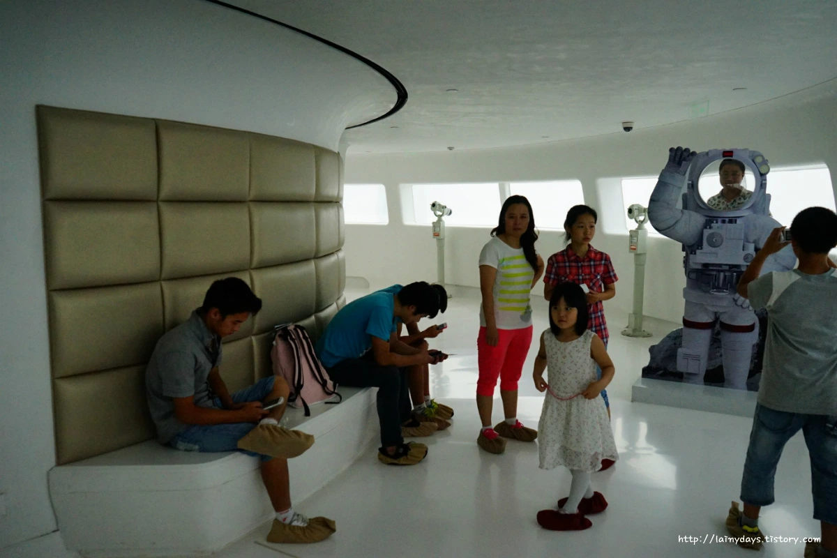 맨 위층 전망대로 들어가려면 필히 덧신을 신어야 한다. 강원도에 한반도 지형을 볼 수 있는 전망대인 스카이워크도 역시 덧신을 신어야 입장이 가능한데, 거기는 바닥이 유리이기 때문에 훼손 방지를 목적으로 신는다 해도 이 곳은 바닥이 유리도 아닌데 왜 신어야 하는지는 정확히 모르겠다. 아무튼 스페이스 캡슐이라는 별칭에 맞게 안내원이 은색으로 된 우주복을 입고 있다.