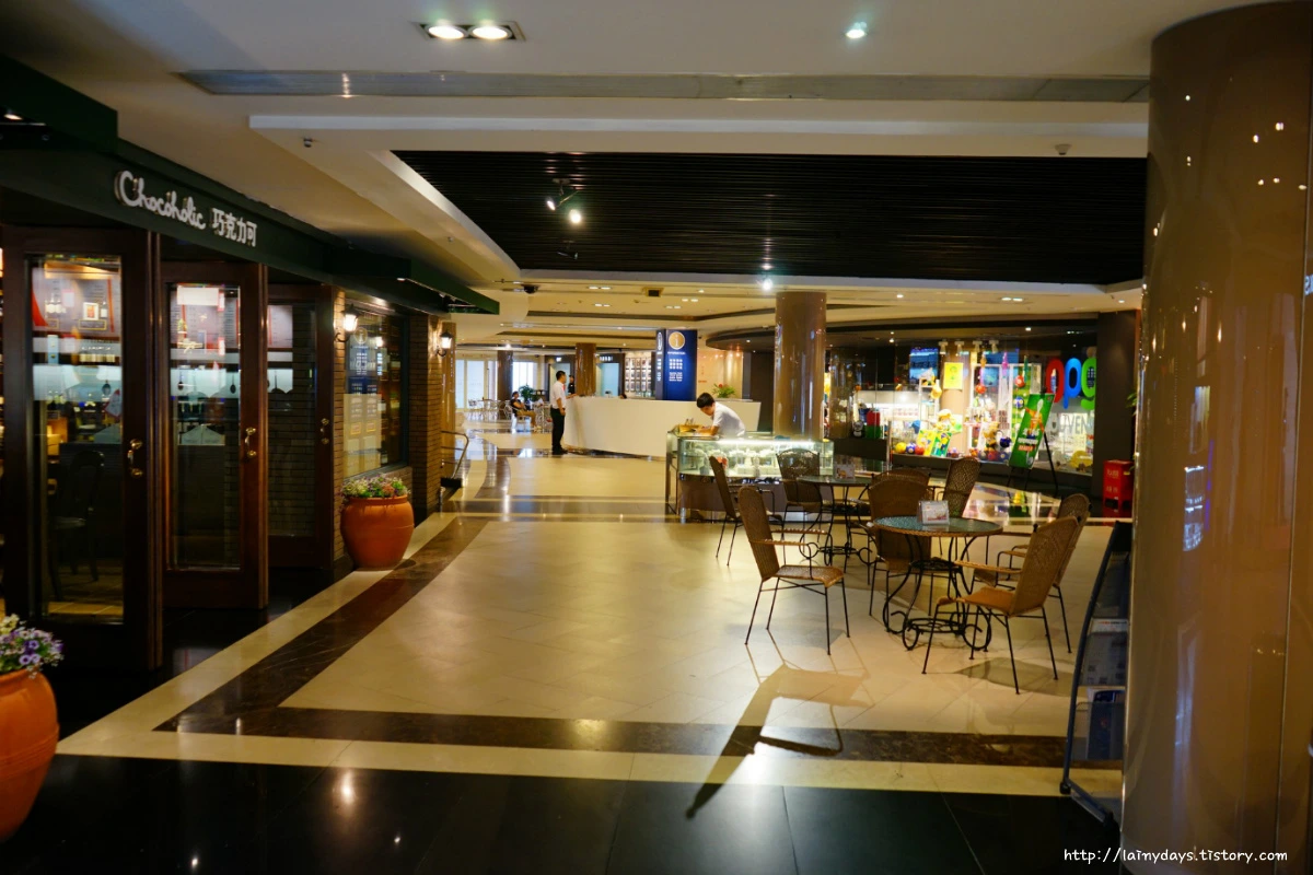 티켓 검사하는 곳을 지나 동방명주 중앙 엘리베이터로 향하는 길. 건물의 테두리는 자연스럽게 사람들을 일렬로 정렬시키는 기능을 한다. 사람이 없긴 해도 엘리베이터 줄은 꽤나 길다. 태울 수 있는 정원에 한계가 있기 때문에.