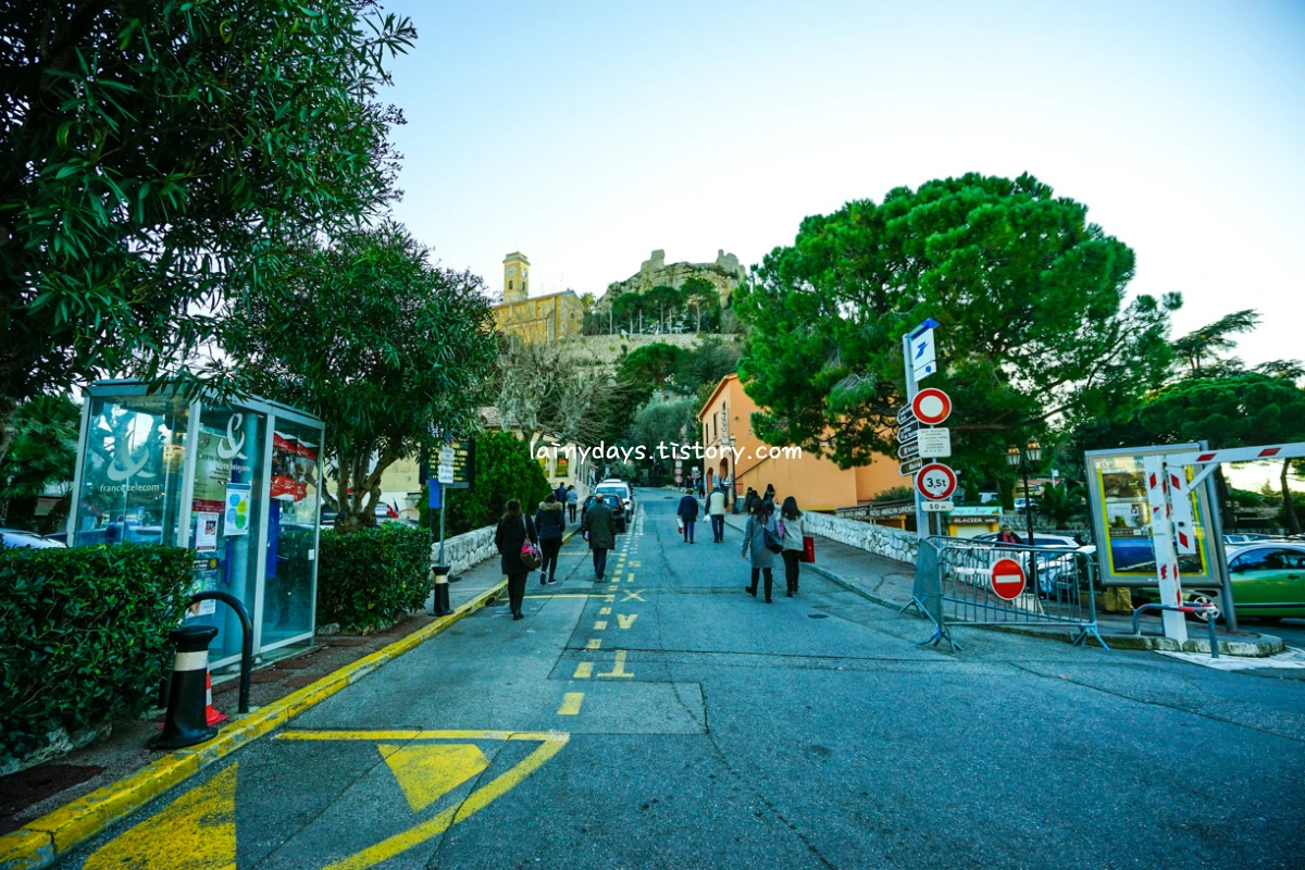 에즈 빌리지 입구에 있는 정류소에서 에즈 빌리지를 가려면 상당히 가파른 오르막을 올라가야 한다. 따라서 이곳에서 1박을 할 것이 아니라면 최대한 가벼운 몸과 마음으로 오는 것이 좋다. 나의 경우 에즈 빌리지 안에 있는 호텔인 샤토에 자에서 1박을 할 계획으로 왔기 때문에 무거운 캐리어를 들고 저 오르막을 올라갔다.