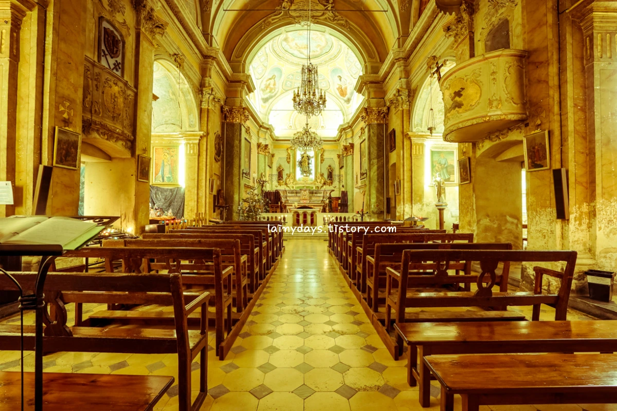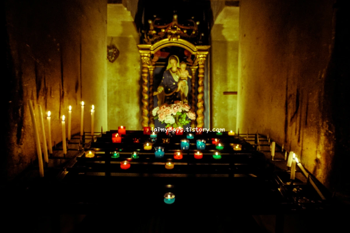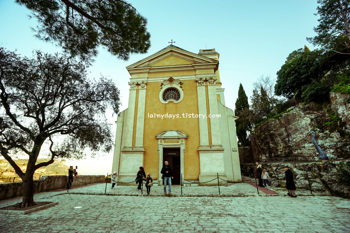 마을을 내려오면서 마주쳤던 성당에 다시 가서 내부를 돌아본다. 밖은 어둠이 드리웠으나 성당 안은 이상하리만치 밝다. 사람이 없는 이곳에서 잠시 기도를 드리고 천천히 성당을 둘러본다. 가톨릭 신자가 아니더라도 이 성당은 이시각에 올만한 가치가 있다. 정말로 딱, 에즈 빌리지에 들어맞는 분위기라고 해야 할까.. 소박하면서도 화려하다는 앞뒤가 전혀 맞지 않는 표현이 이 성당엔 어울린다.
