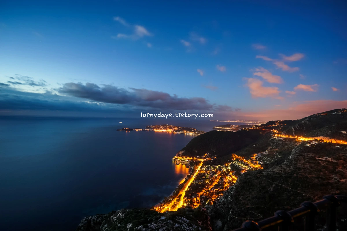 성당 앞뜰에서 내려다본 근처 마을의 모습 또한 아름답다. 노을이 지면 노을 지는대로, 어둠이 내려앉으면 또 그런대로 고즈넉하고 넉넉한 풍경을 보여주는 에즈 빌리지