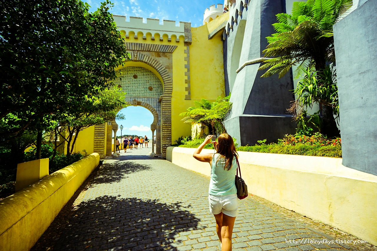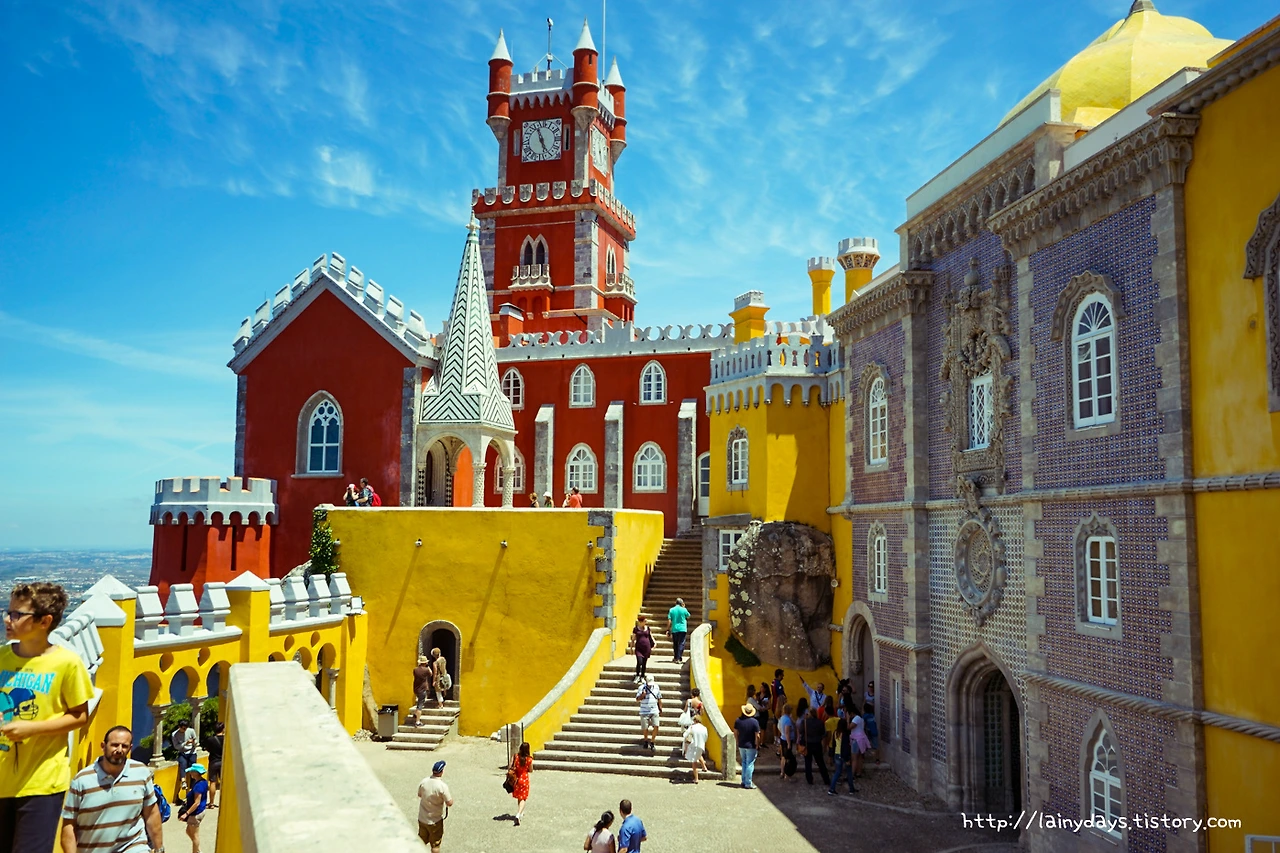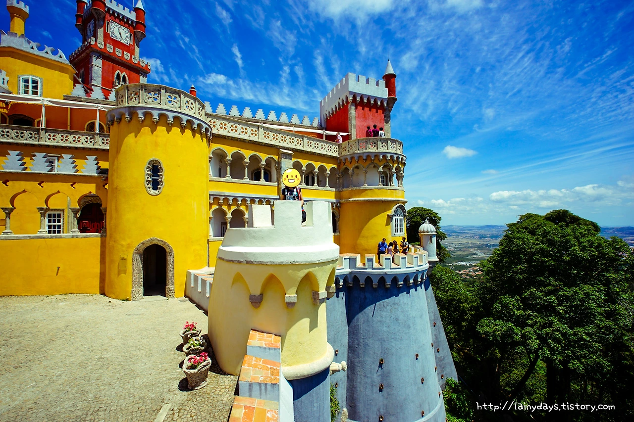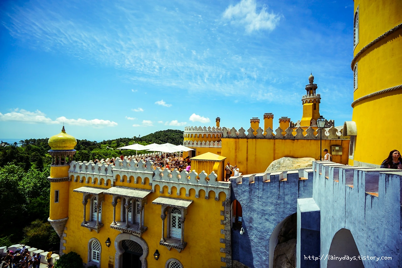 좁은 통로를 따라 조금만 걷다 보면 이내 페나성 앞마당에 들어올 수 있다. 그리고 눈에 보이는 페나성의 전경은 바로 이렇다. 머릿속에 바로 떠오르는 생각은 '색은 화려하고 모습은 기괴하다'. 먼저 색을 보자. 성이 전체적으로 원색을 잘 그리고 많이 활용했는데 노란색과 빨간색 그리고 파란색이 대표적이다. 파란색은 성을 떠받드는 밑부분에 주로 사용되었고, 노란색은 성의 주 건물에 사용되었고, 빨간색은 특정 부분에 포인트로 많이 사용되었다. 인상적인 것이.. 인공적인 색상 자체는 노랑 빨강 파랑이 주로 쓰였지만 성 아랫부분을 감싸는 숲의 초록색과도, 그리고 성의 뒷 배경이 되는 하늘의 파란색도 마치 성의 일부인 양 자연스럽게 녹아들어가고 있다는 점이다.