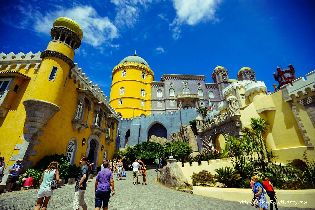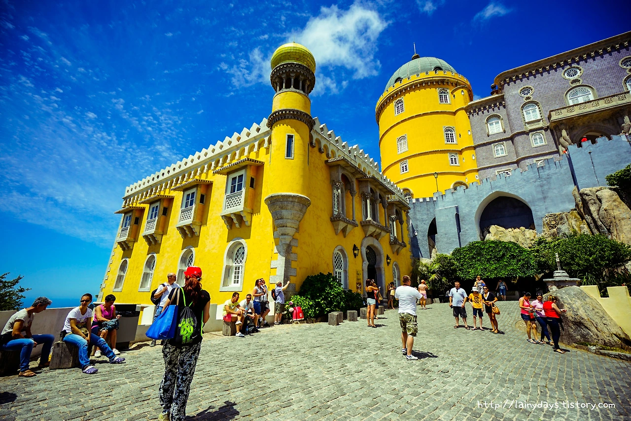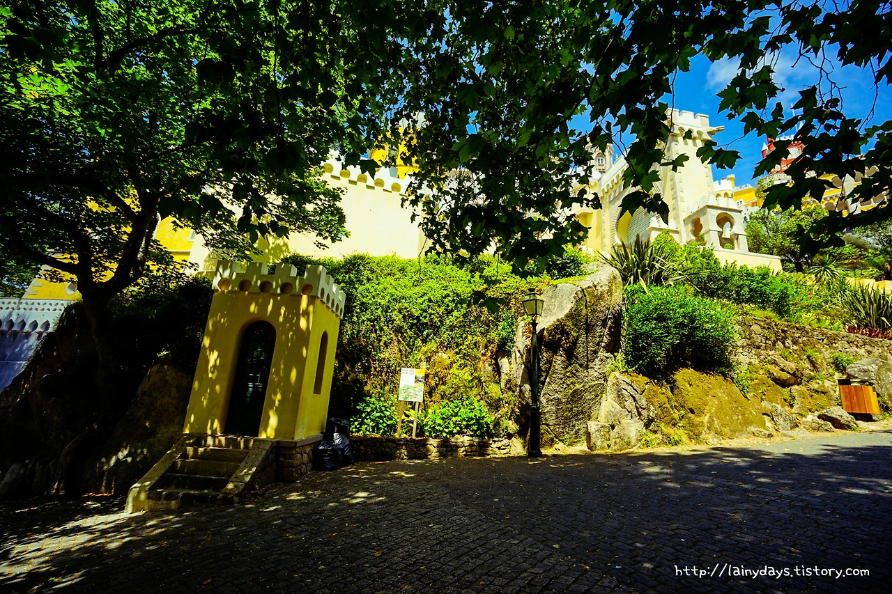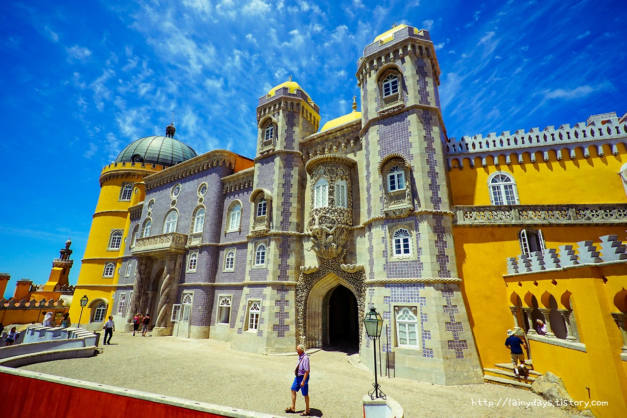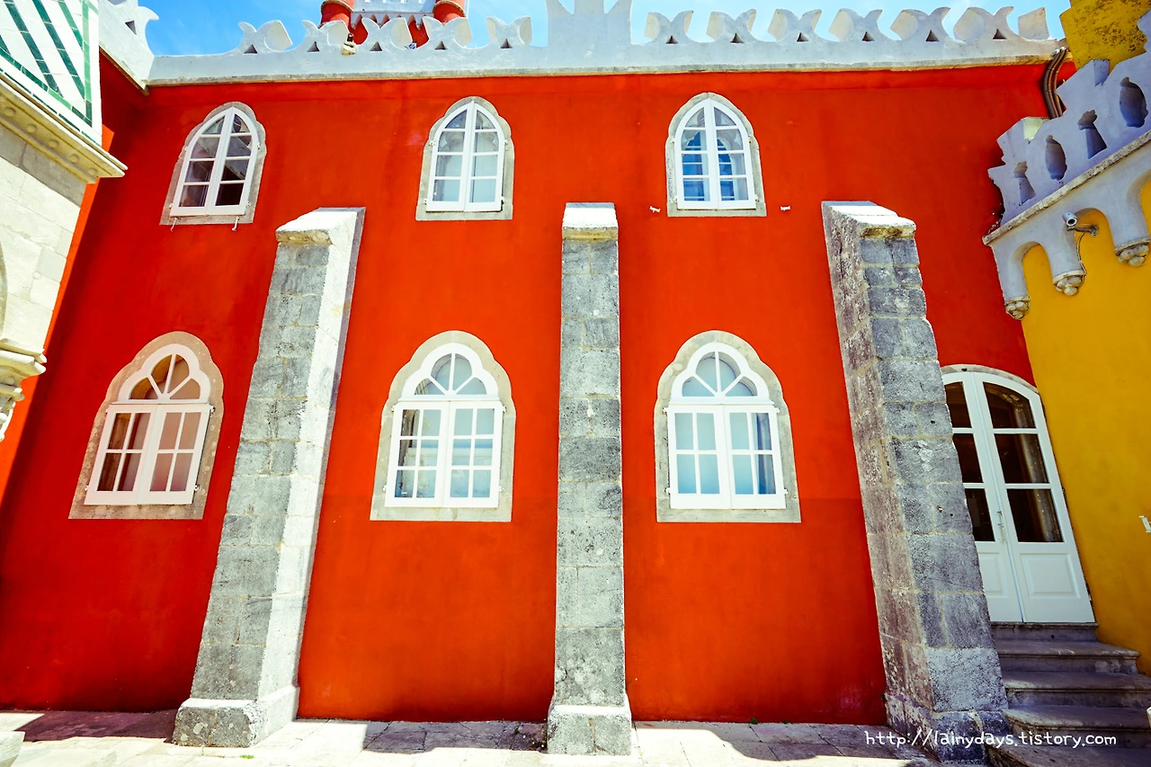 좁은 통로를 따라 조금만 걷다 보면 이내 페나성 앞마당에 들어올 수 있다. 그리고 눈에 보이는 페나성의 전경은 바로 이렇다. 머릿속에 바로 떠오르는 생각은 '색은 화려하고 모습은 기괴하다'. 먼저 색을 보자. 성이 전체적으로 원색을 잘 그리고 많이 활용했는데 노란색과 빨간색 그리고 파란색이 대표적이다. 파란색은 성을 떠받드는 밑부분에 주로 사용되었고, 노란색은 성의 주 건물에 사용되었고, 빨간색은 특정 부분에 포인트로 많이 사용되었다. 인상적인 것이.. 인공적인 색상 자체는 노랑 빨강 파랑이 주로 쓰였지만 성 아랫부분을 감싸는 숲의 초록색과도, 그리고 성의 뒷 배경이 되는 하늘의 파란색도 마치 성의 일부인 양 자연스럽게 녹아들어가고 있다는 점이다.