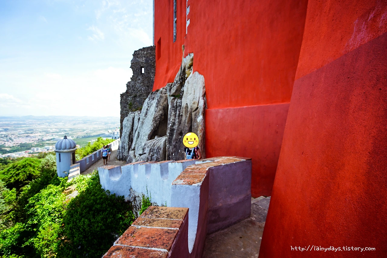 빨간 건물을 감싸는 외곽 길을 따라 걸으면 다시 앞마당으로 나온다(좌하단) 앞마당으로 나오면 페나성 최고의 포토 포인트가 있는데 (우하단) 이곳에 오르면 페나성의 전경도 그리고 산 아래 풍경도 정말 예쁘게 내려다보인다. 그리고 저 위에 올라간 채 담은 사진 역시 예쁘게 나온다. 덕분에 저곳은 언제나 사진을 찍으려는 사람들로 북적인다.