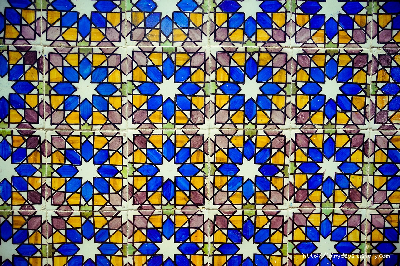 페나성 어느 벽에 붙어 있던 아줄레주. 이 것 역시 멀리서 보면 아무 생각 없이 '아.. 아줄레주네' 하고 넘어갈 수 있는데 잘 보면 정말 정성스럽고 정교하게 이어 붙인 타일임을 알 수 있다. 타일 중앙에 있는 별무늬는 파란색이고 네 귀퉁이에 1/4 조각의 별이 있는데 타일을 잘 이어 붙여 프랙털 마냥 파란 별과 보라색 별이 끝없이 반복되는 모습으로 만들어냈다. 다른 사람은 그냥 치는 곳에 서서 혼자 조용히 감탄했던 곳.