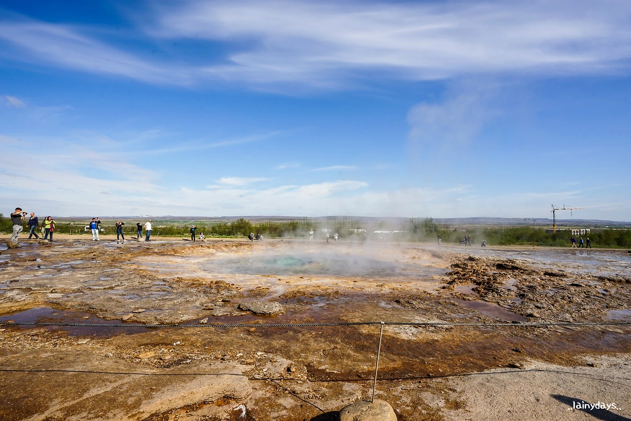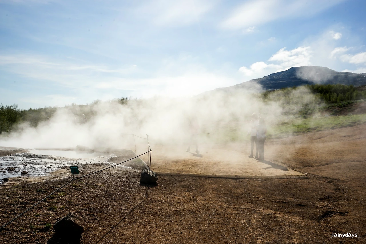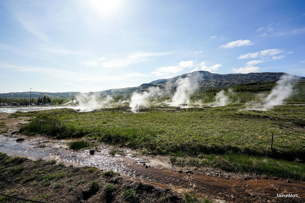 주차장 바로 앞을 작은 개울이 하나 지나가는데 뭔가 연기가 자욱하게 나는 것이 제대로 왔구나 싶었다. 사진이나 영상에서만 보던 신기한 장면을 직접 눈으로 볼 수 있다니 입구부터 내 가슴은 두근거리기 시작했다. 특별한 표지판이 없기에 어디로 가야할지 잠시 망설였지만, 많은 사람들이 향하는 곳을 따라가보니 저 멀리 땅바닥에서 연기가 모락모락 솟아오르는게 보인다. 간헐천을 뜻하는 영어단어인 Geyser가 아이슬란드어인 Geysir에서 유래되었다고 한다.