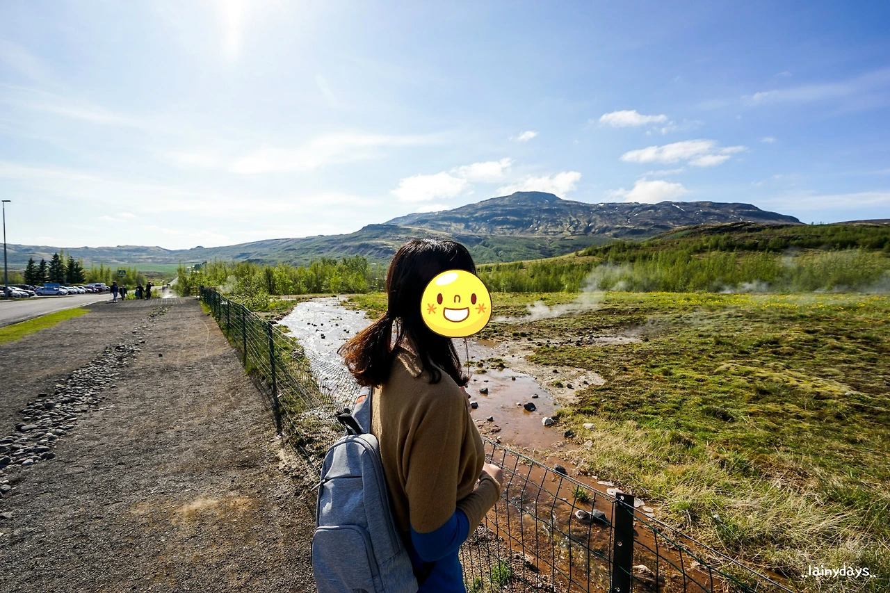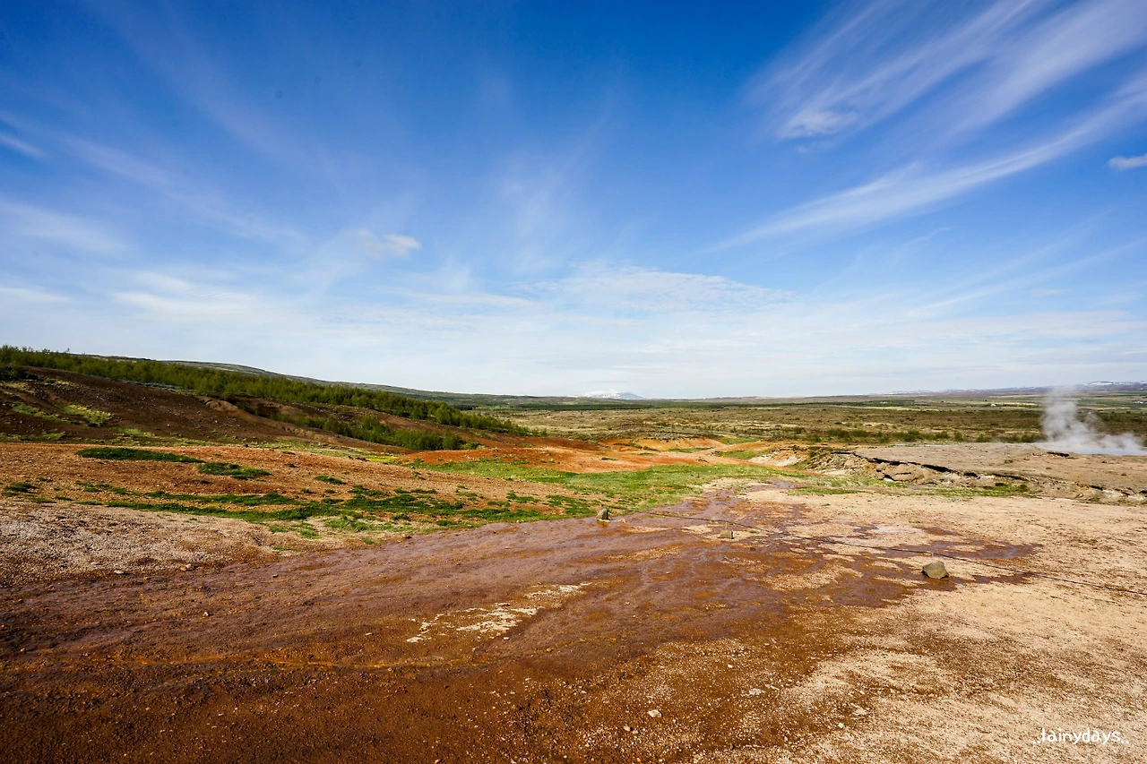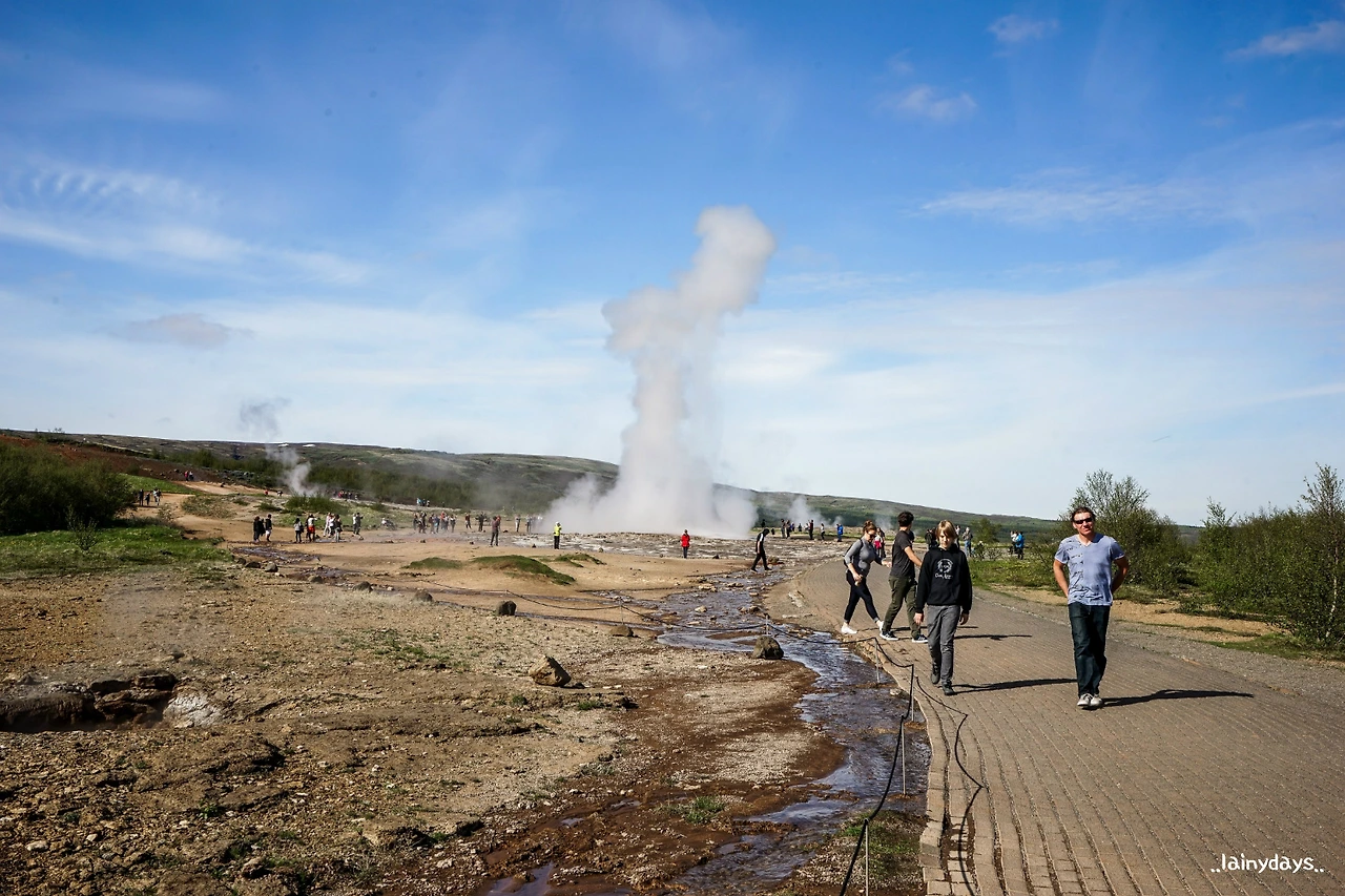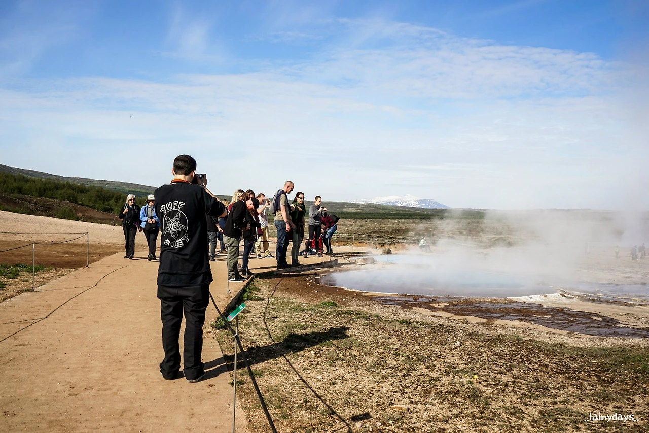 주차장 바로 앞을 작은 개울이 하나 지나가는데 뭔가 연기가 자욱하게 나는 것이 제대로 왔구나 싶었다. 사진이나 영상에서만 보던 신기한 장면을 직접 눈으로 볼 수 있다니 입구부터 내 가슴은 두근거리기 시작했다. 특별한 표지판이 없기에 어디로 가야할지 잠시 망설였지만, 많은 사람들이 향하는 곳을 따라가보니 저 멀리 땅바닥에서 연기가 모락모락 솟아오르는게 보인다. 간헐천을 뜻하는 영어단어인 Geyser가 아이슬란드어인 Geysir에서 유래되었다고 한다.
