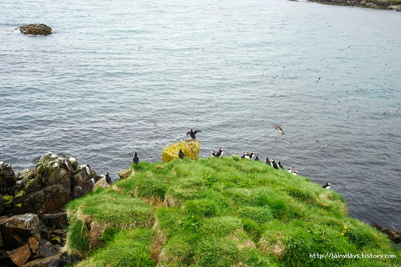 반도지형의 언덕에 가까이 다가가면 뭔가 새들이 언덕 위에 자리잡고 있는 것이 보인다. 더욱 가까이 다가가면 그토록 찾아 헤매(?)던 퍼핀이 보인다. 반신반의 하며 찾아온 곳인데 실제로 보다니 이 때 만큼은 정말 흥분을 감추지 못했다. 계단을 따라 언덕을 오르면 전체적인 풍경이 보인다. 왼편에는 운전해서 온 94번 도로가 보이고 작은 항구의 모습을 하고 있는 이곳의 모습이 보인다.