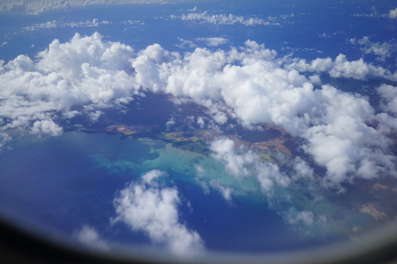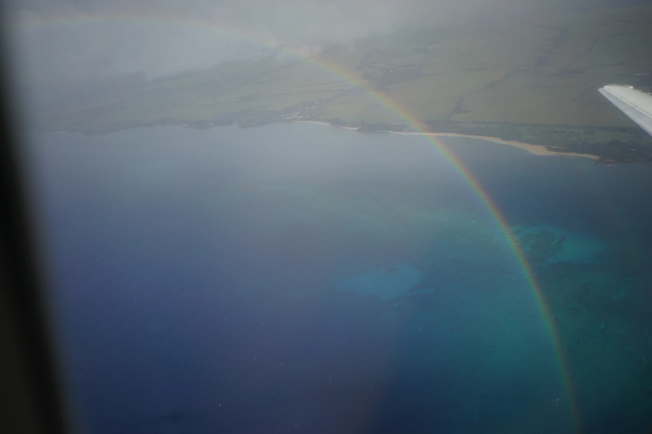 이륙할 때 활주로에서부터 보이던 무지개가 두려움을 풀어주었고, 창 밖으로 보이던 아름다운 하와이 제도의 바다와 여러 섬은 비행 공포증을 싹 없애줄 정도로 아름답고 멋졌다. 처음으로 하늘을 난다는 게 이렇게나 재밌구나를 깨닫게 해 준 비행.