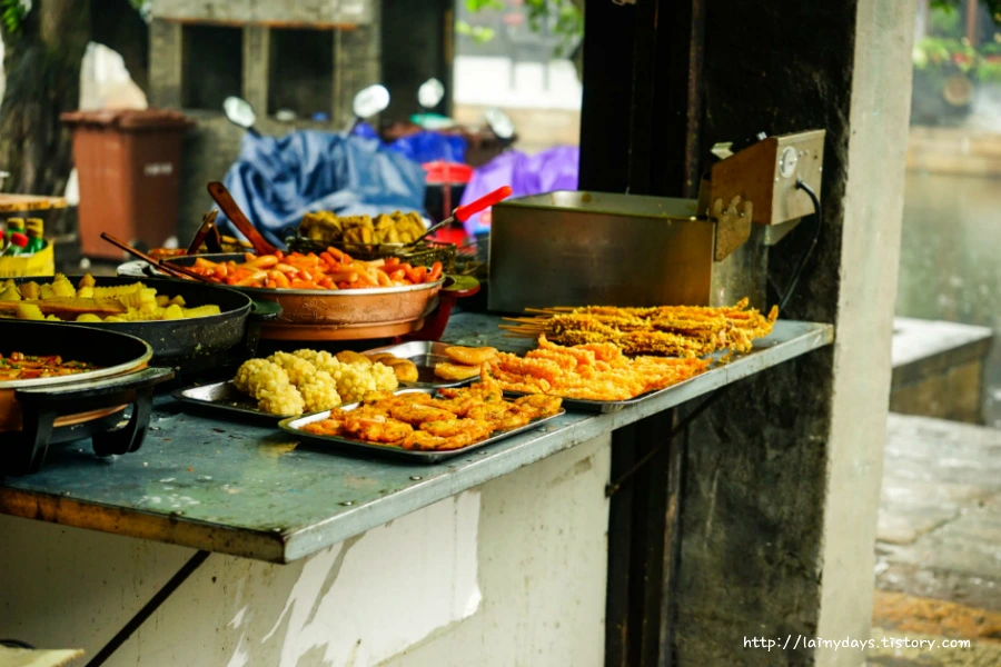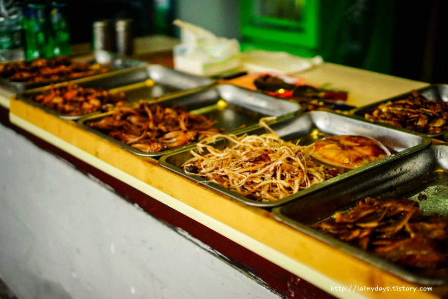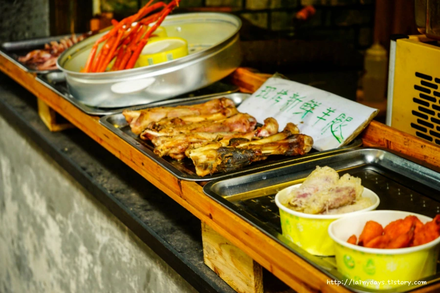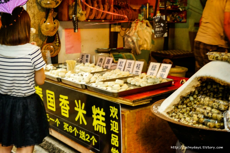 잘 개발된 도시보다 이런 작은 마을에서 중국 특유의 독특한 음식을 만날 수 있다. 하지만 비위가 약한 나에게 중국 로컬 음식은 그림의 떡일 뿐. 한자 문맹인이라 안정적인? 음식을 고르기 위해선 순전히 시각과 후각에 의존해야 했는데 그 둘 다 마비시키는 것이 중국 음식들 (비하는 아닙니다. 제 비위가 약해서일 뿐..)
