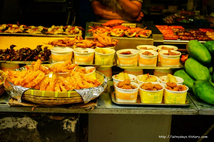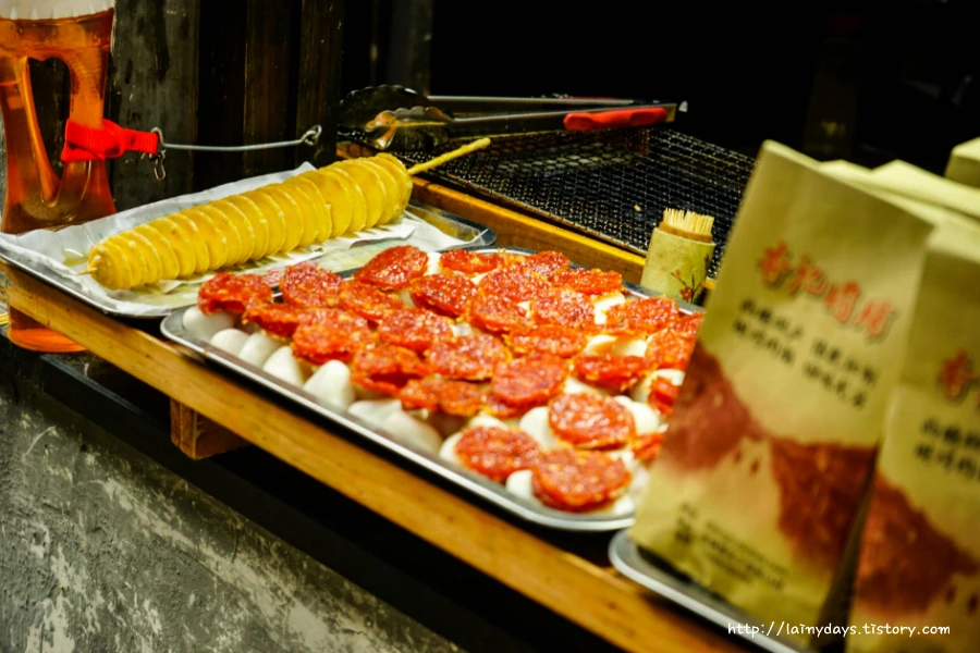 시탕 구석구석을 걷다보면 또 마주치는 길거리 음식. 소시지와 육포 같은 느낌. 정말..손이 막 끝까지 뻗쳤지만 끝내 시도해보지 못한. 정체불명의 음식들이 많았다. 내가 다른 나라에 있긴 있구나.. 를 느끼게 해주는 것들. 아마도? 물고기 모양의 딤섬까지.